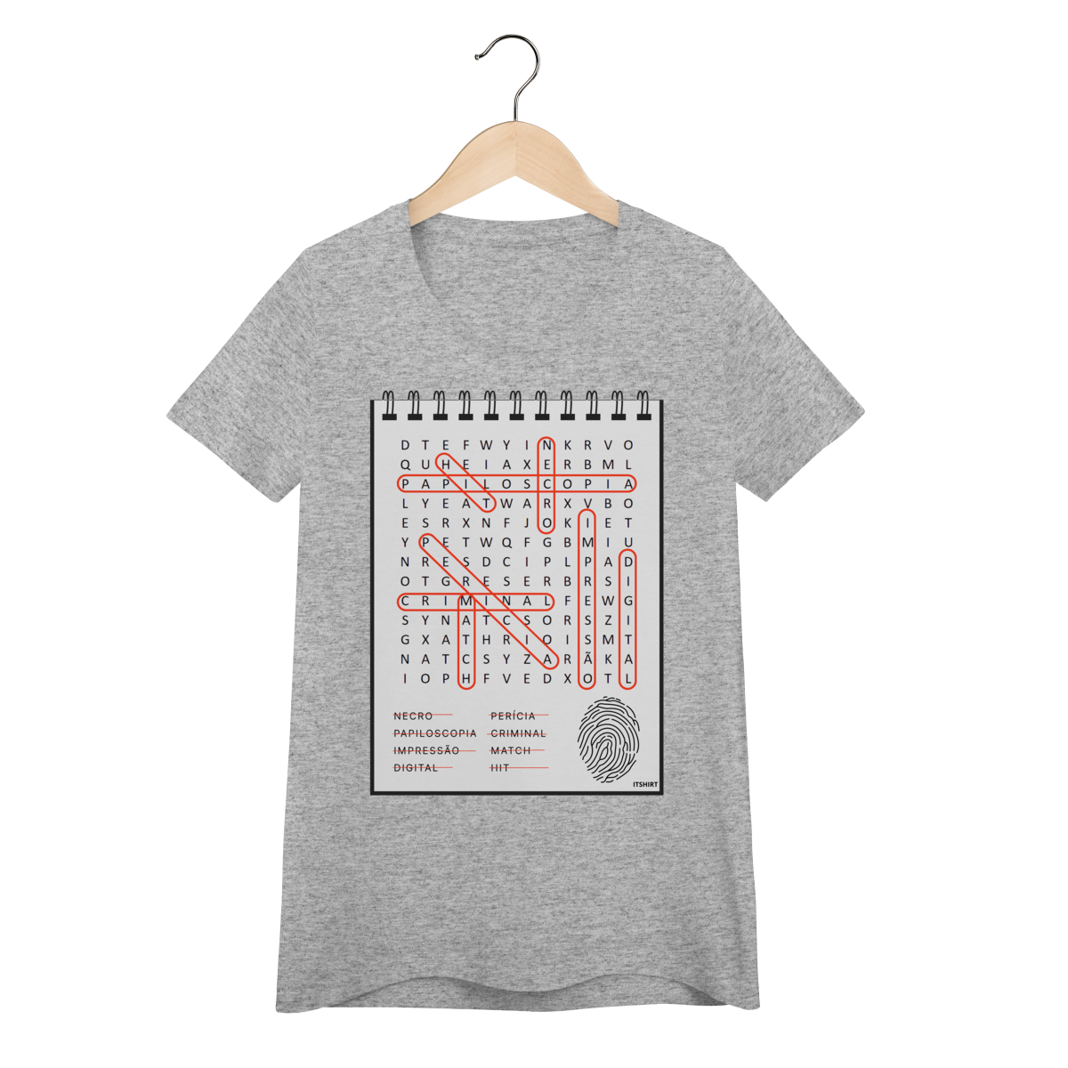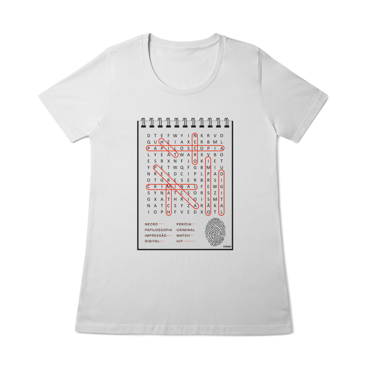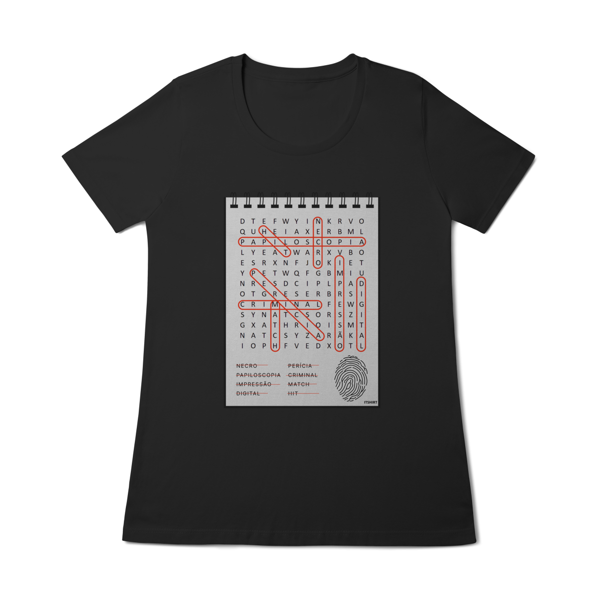 Uma peça única que une estética e ciência: nossa camiseta apresenta uma estampa em formato de caça palavras, com termos emblemáticos da identificação por impressões digitais.