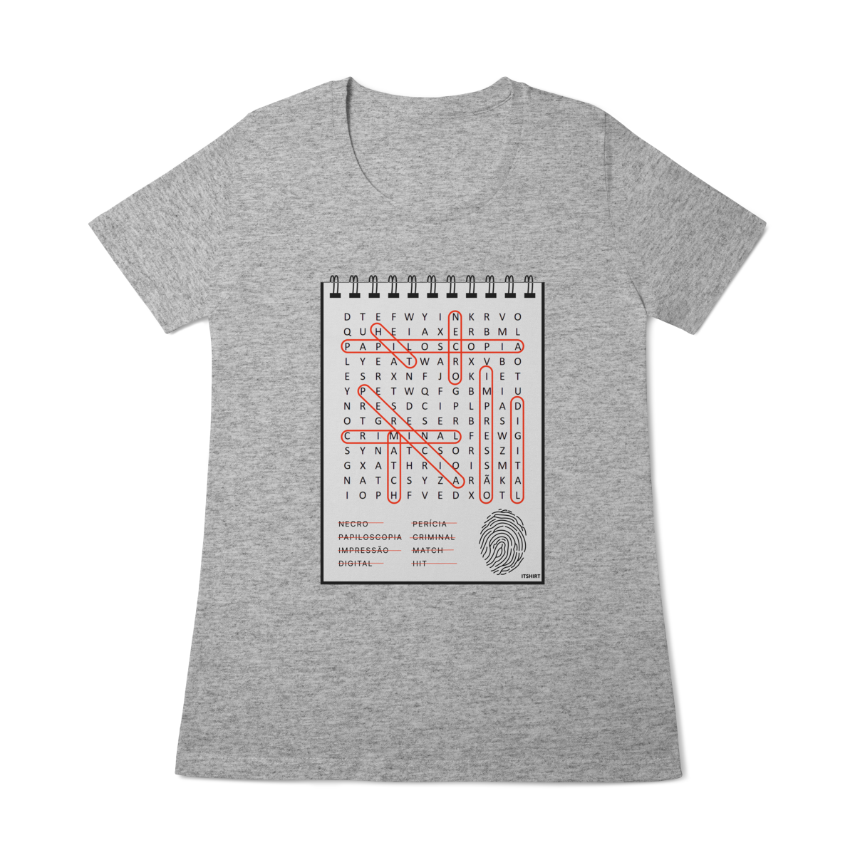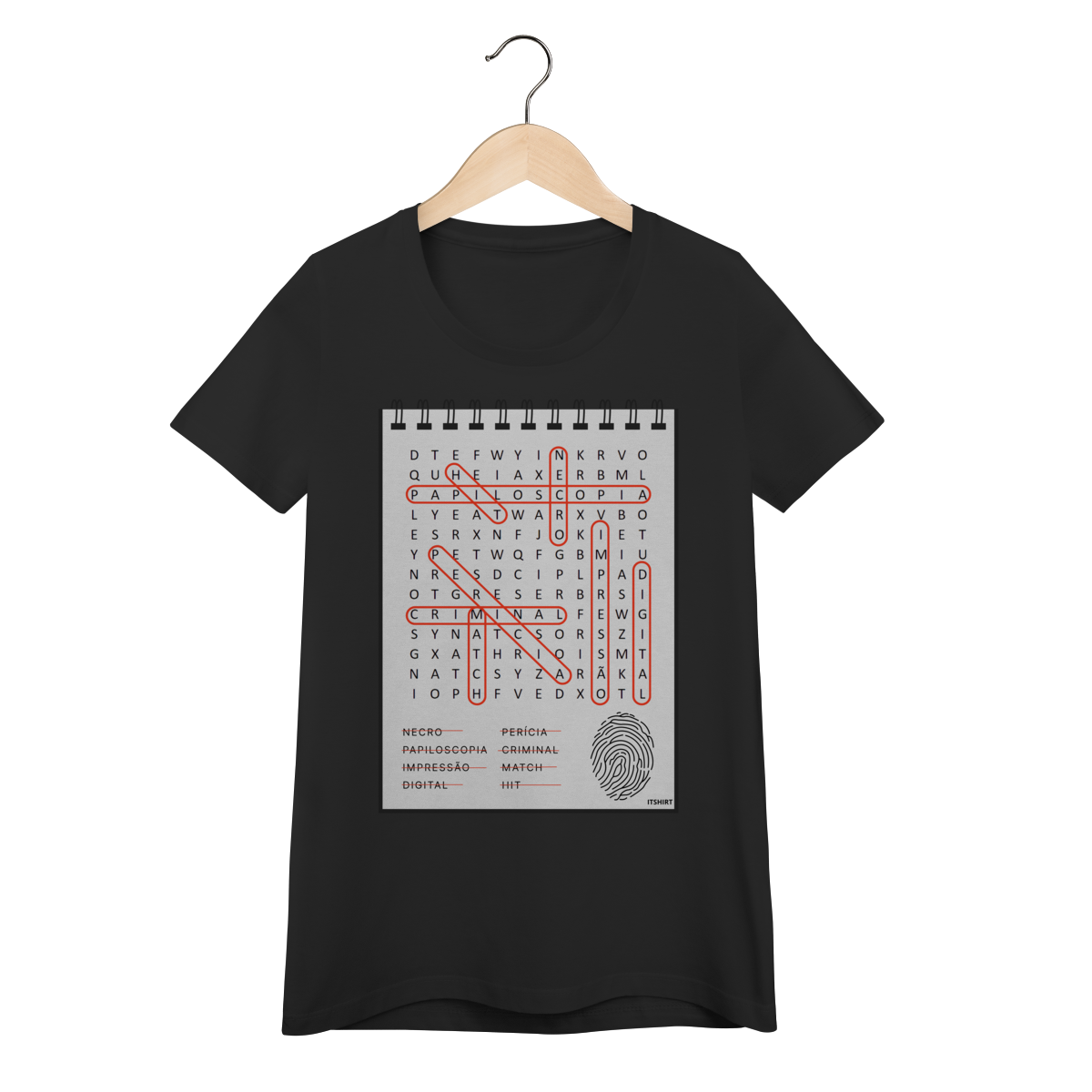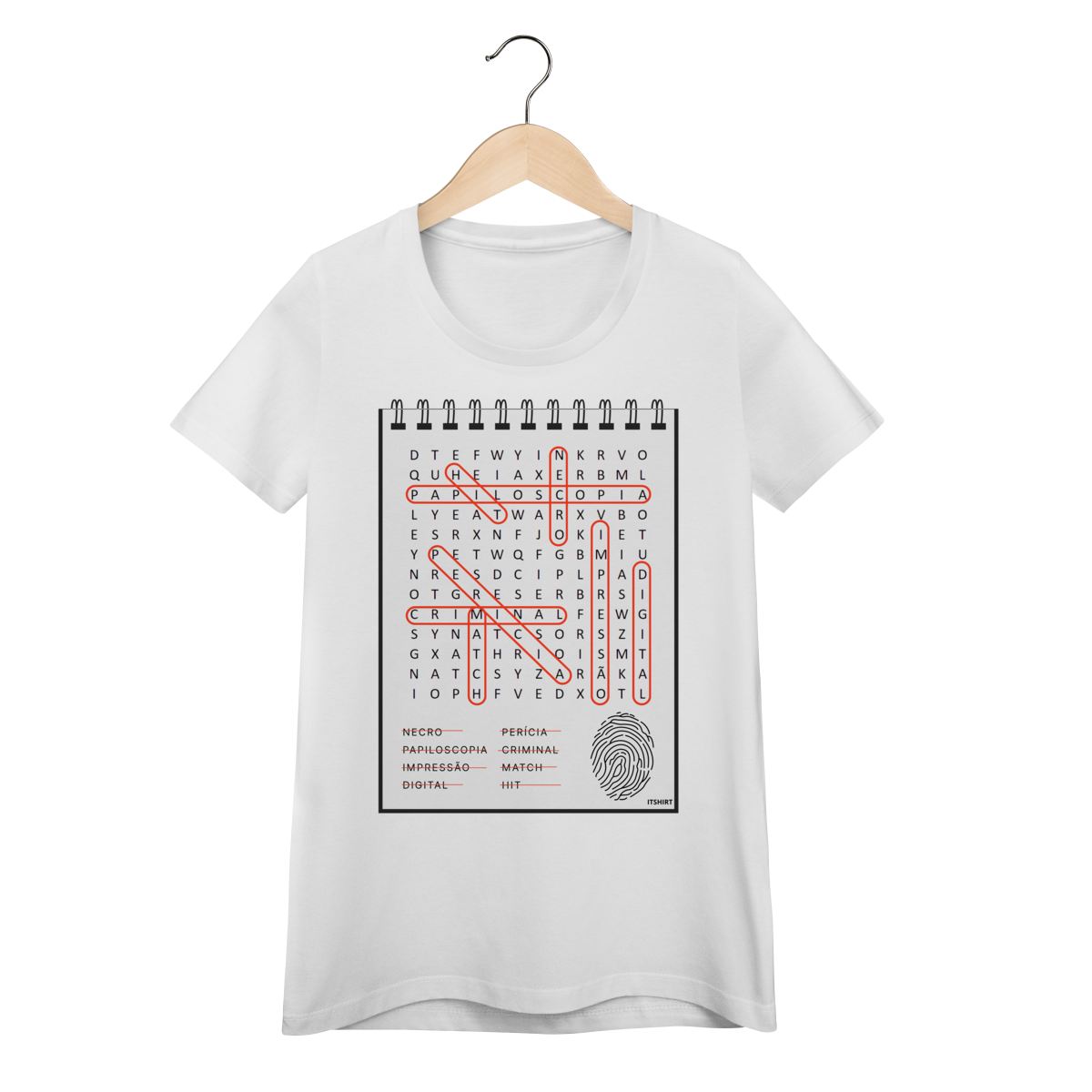 Uma peça única que une estética e ciência: nossa camiseta apresenta uma estampa em formato de caça palavras, com termos emblemáticos da identificação por impressões digitais.