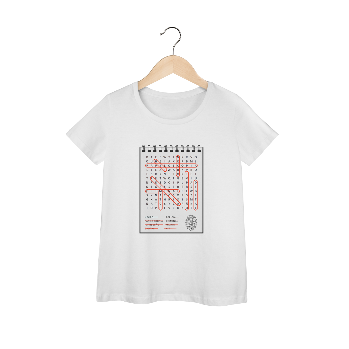 Uma peça única que une estética e ciência: nossa camiseta apresenta uma estampa em formato de caça palavras, com termos emblemáticos da identificação por impressões digitais.