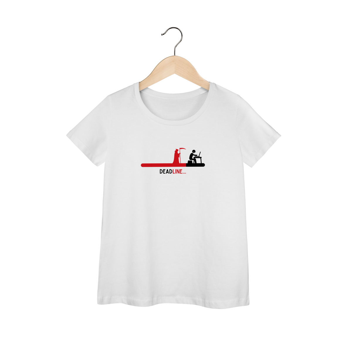 Entre no humor sombrio do cotidiano com esta camiseta que satiriza a pressão dos prazos: a estampa mostra uma figura da morte se aproximando de um personagem ao computador, enquanto a frase "Dead Line" brilha como um aviso fatal — difícil resistir a esse trocadilho criativo!