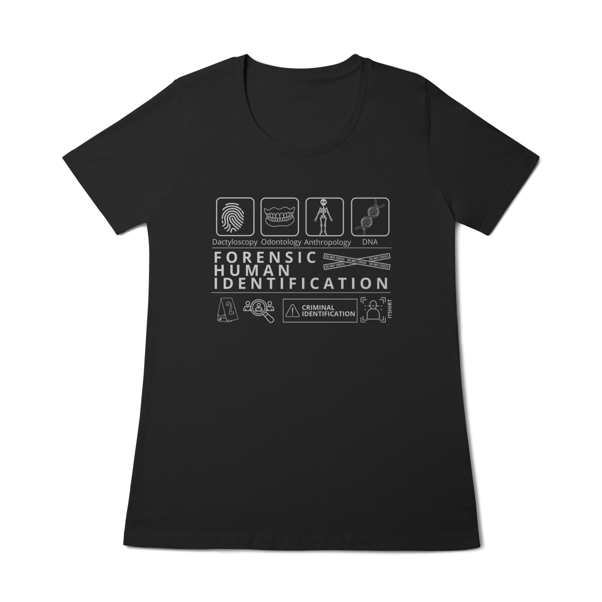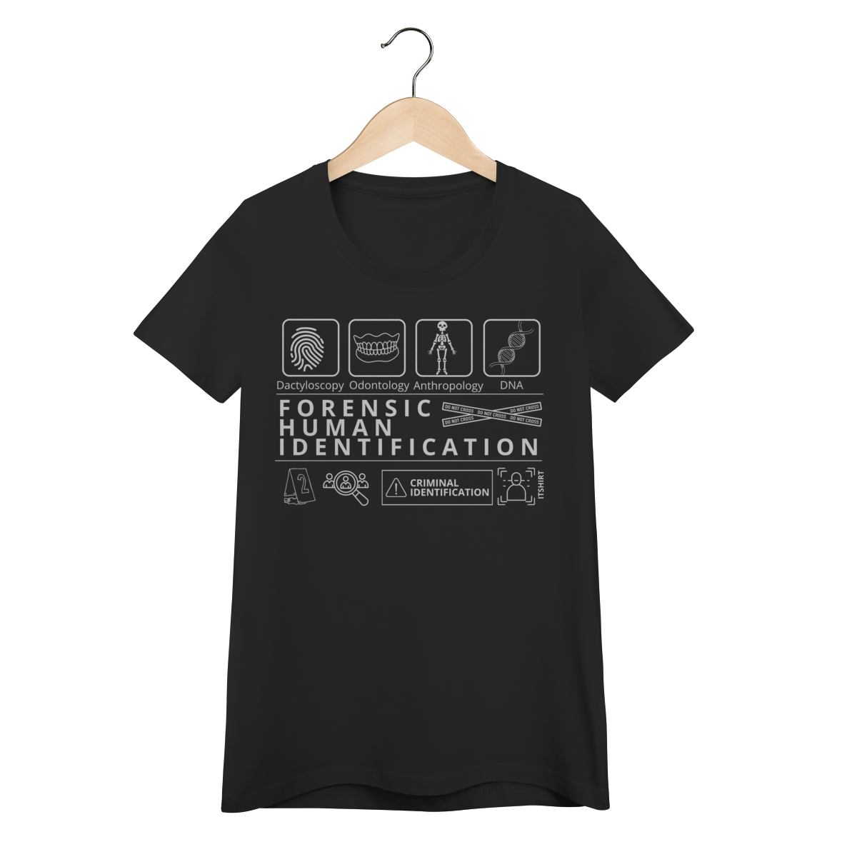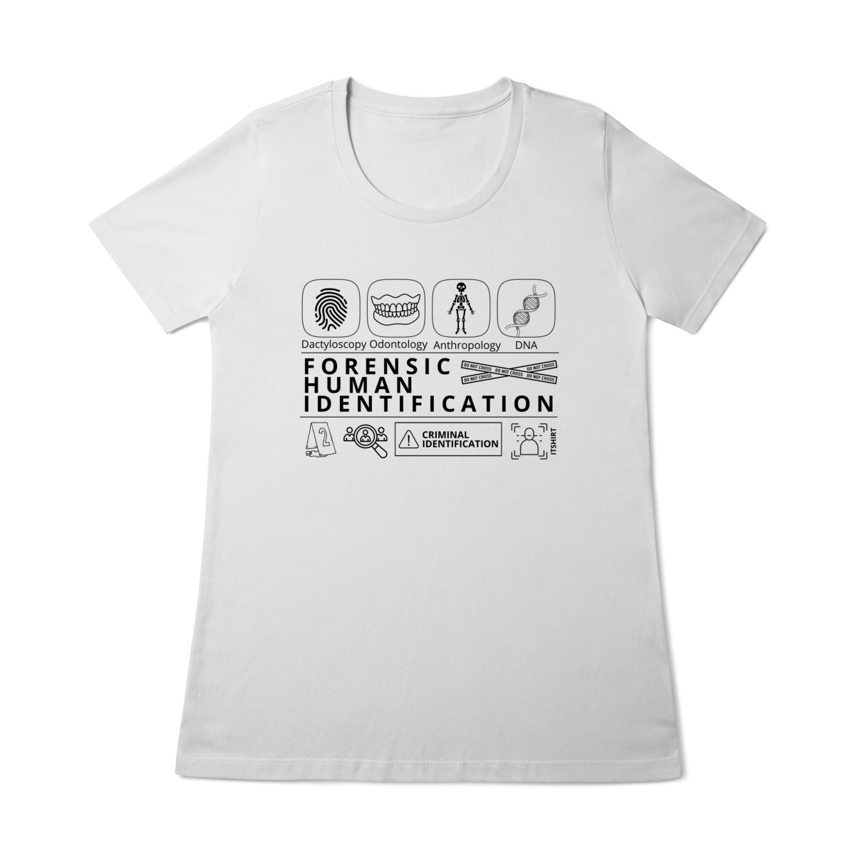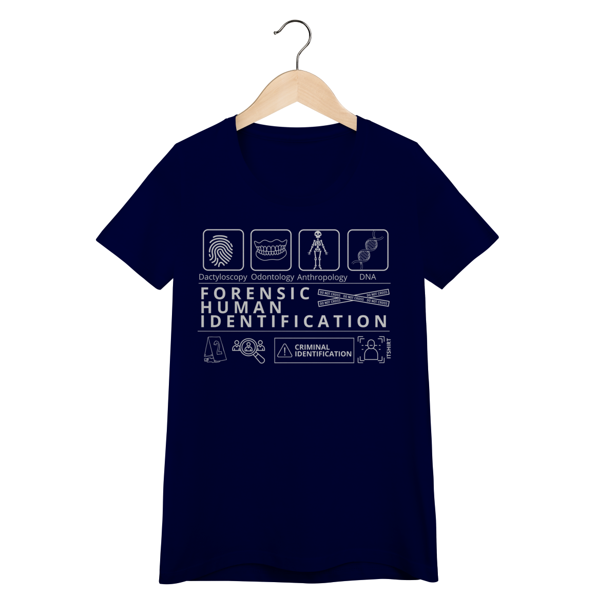 Esta camiseta tem uma estampa inspirada nos principais métodos forenses: papiloscopia, antropologia, odontologia legal e DNA — formando um visual que homenageia a precisão científico-forense. Design exclusivo e significativo: reúne os campos mais relevantes da perícia de identificação, celebrando cada técnica como parte essencial da investigação criminal e humana.