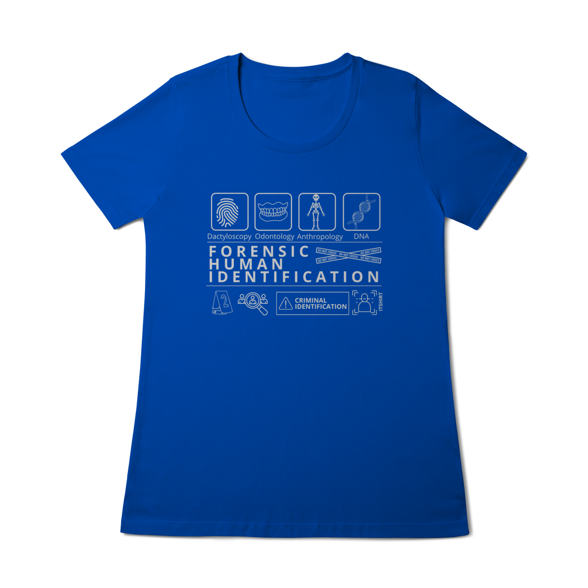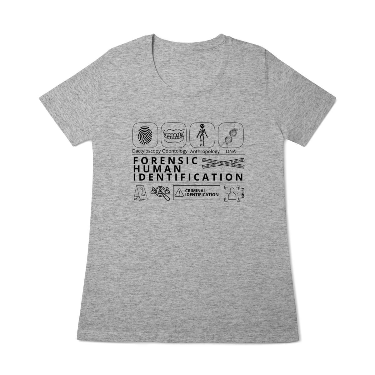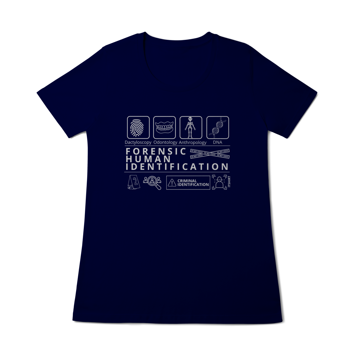 Esta camiseta tem uma estampa inspirada nos principais métodos forenses: papiloscopia, antropologia, odontologia legal e DNA — formando um visual que homenageia a precisão científico-forense. Design exclusivo e significativo: reúne os campos mais relevantes da perícia de identificação, celebrando cada técnica como parte essencial da investigação criminal e humana.