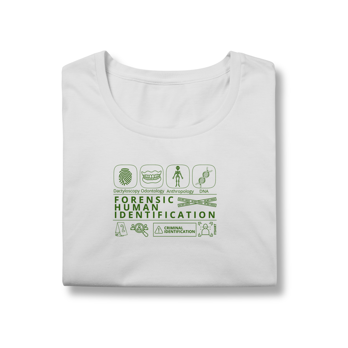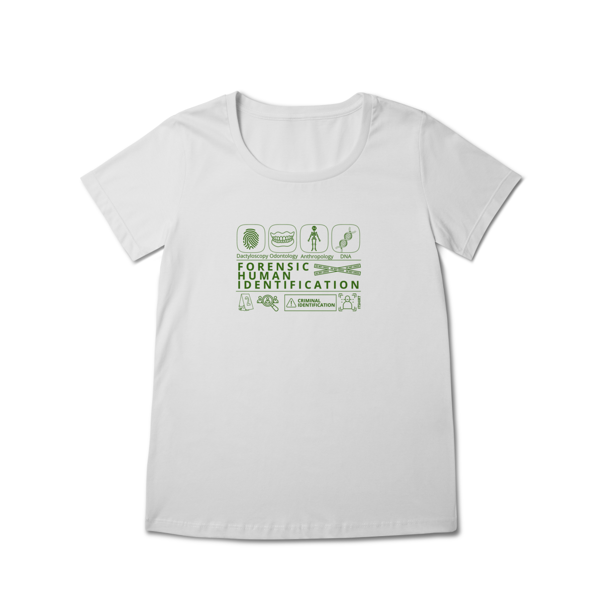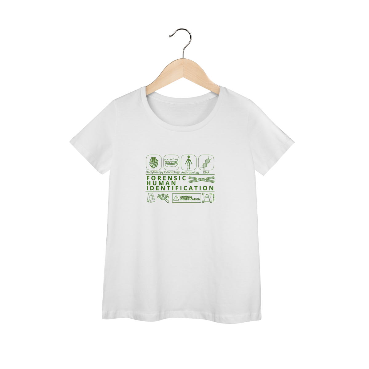 Esta camiseta tem uma estampa inspirada nos principais métodos forenses: papiloscopia, antropologia, odontologia legal e DNA — formando um visual que homenageia a precisão científico-forense. Design exclusivo e significativo: reúne os campos mais relevantes da perícia de identificação, celebrando cada técnica como parte essencial da investigação criminal e humana.