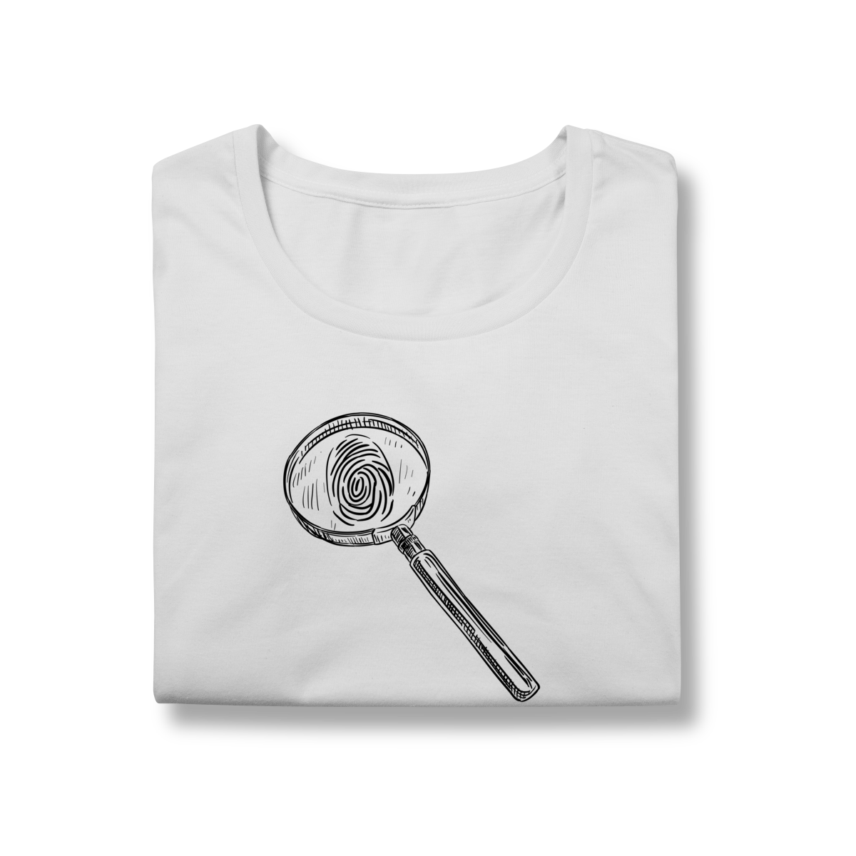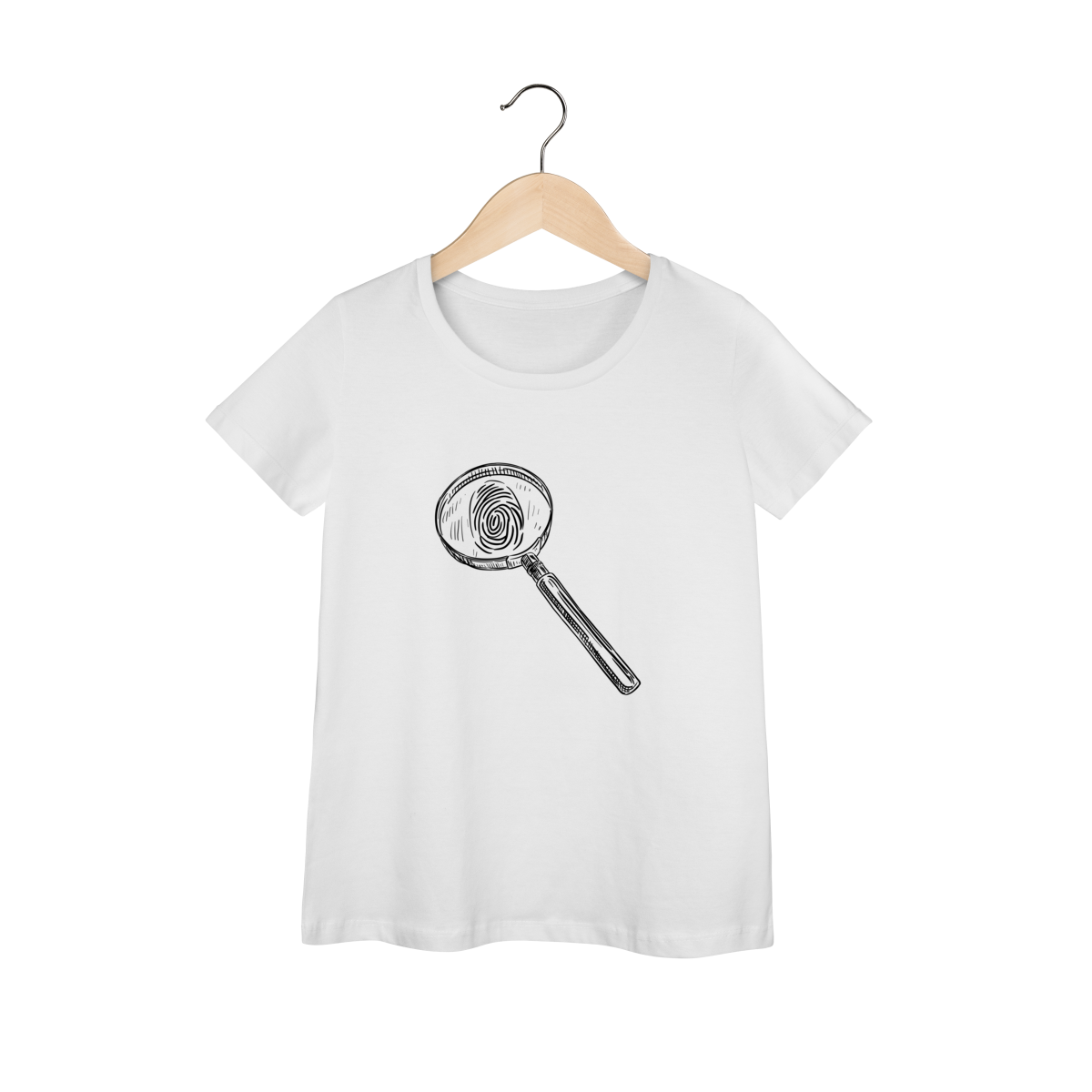 Sente o peso do detalhe: uma lupa, uma digital — o convite para desvendar mistérios. Essa estampa fala de identidade, de mundo interno, de identificação humana através das impressões digitais.