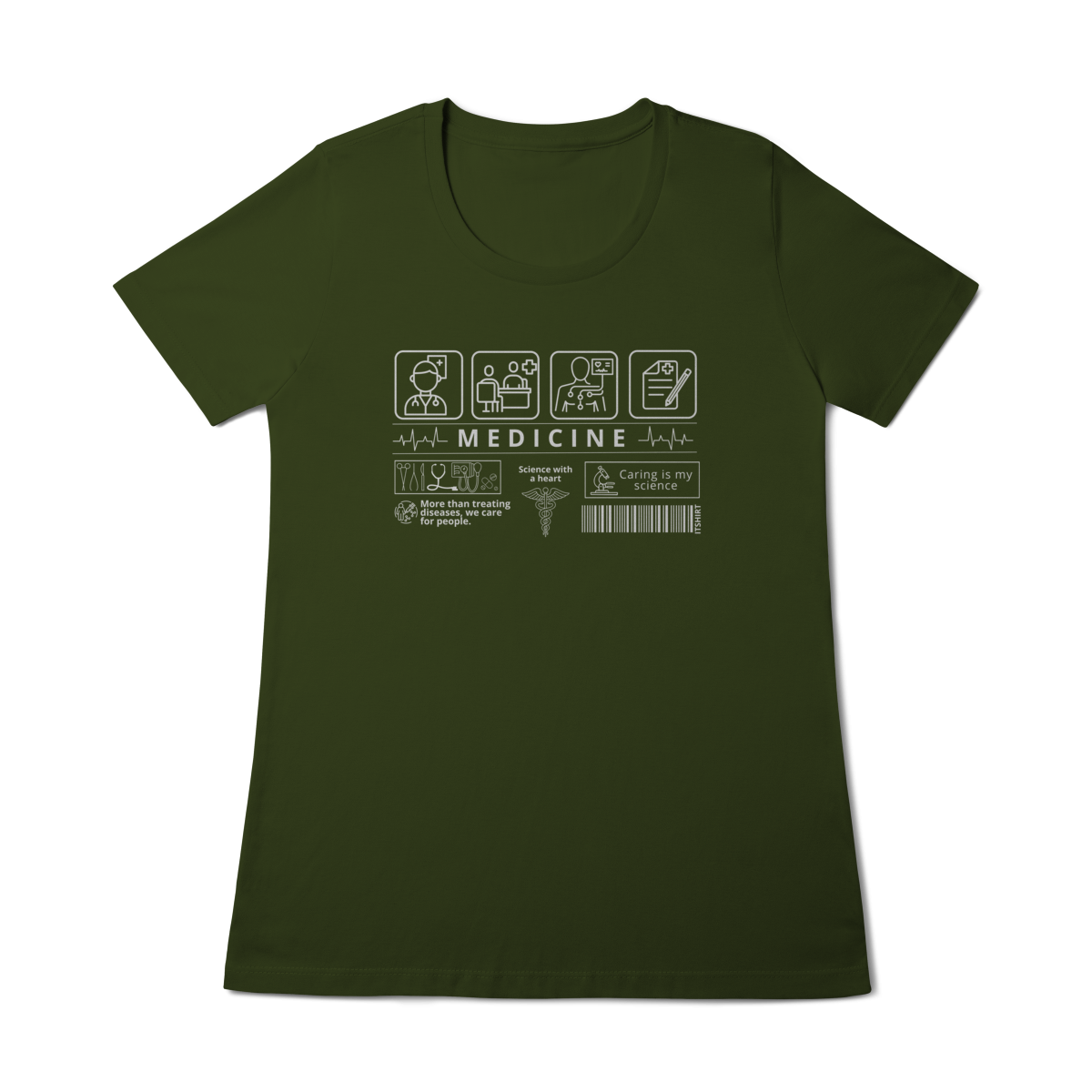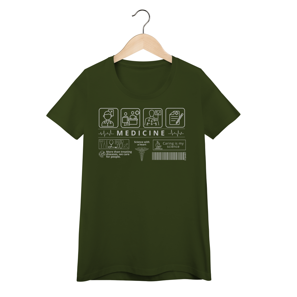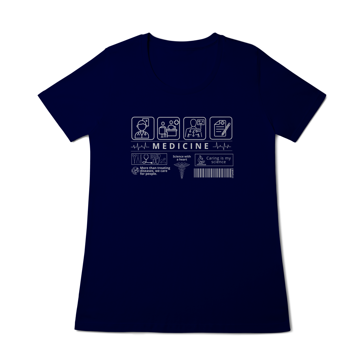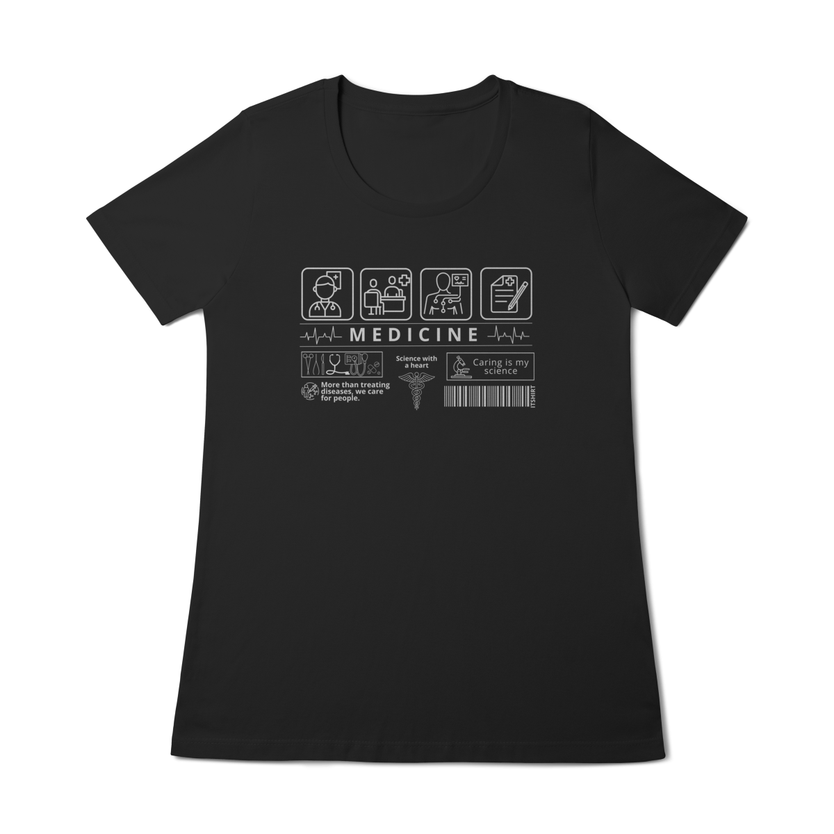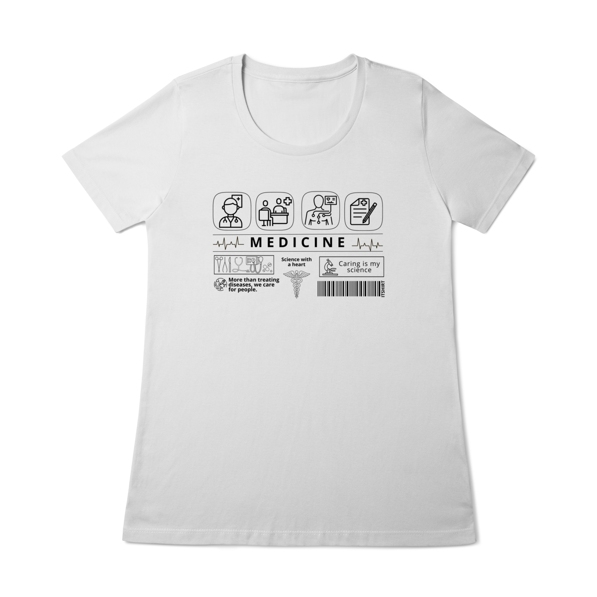 Mostre sua paixão pela arte de curar com estilo: esta camiseta tem estampas com ícones simbólicos da medicina que representam cuidado, ciência e vocação.