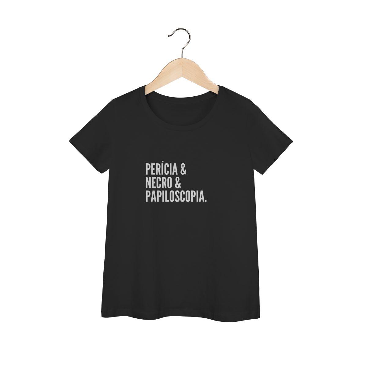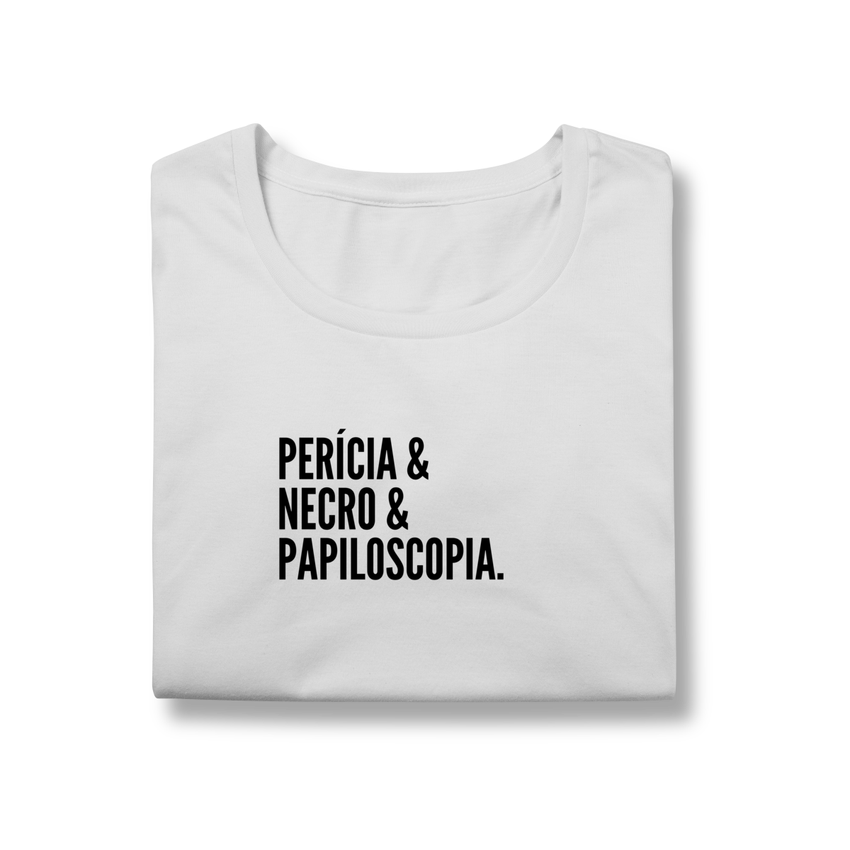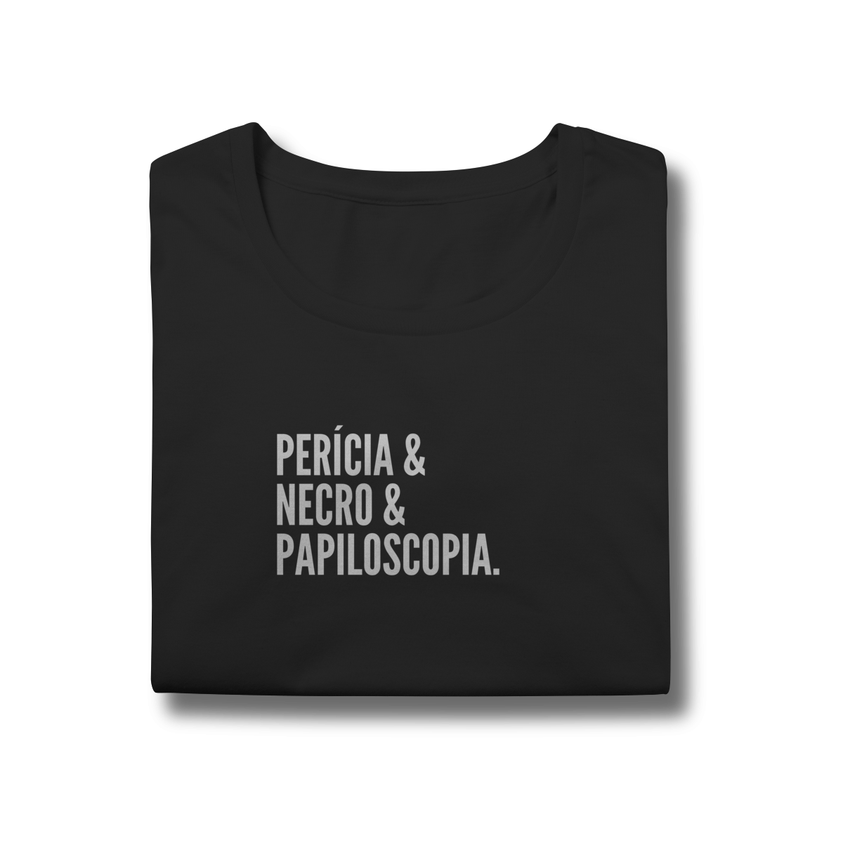 Expresse admiração pela ciência forense com esta camiseta impactante. A estampa exibe as palavras “Perícia & Necro & Papiloscopia”, simbolizando os pilares da identificação humana em cadáveres através de impressões digitais, também chamada de necropapiloscopia.