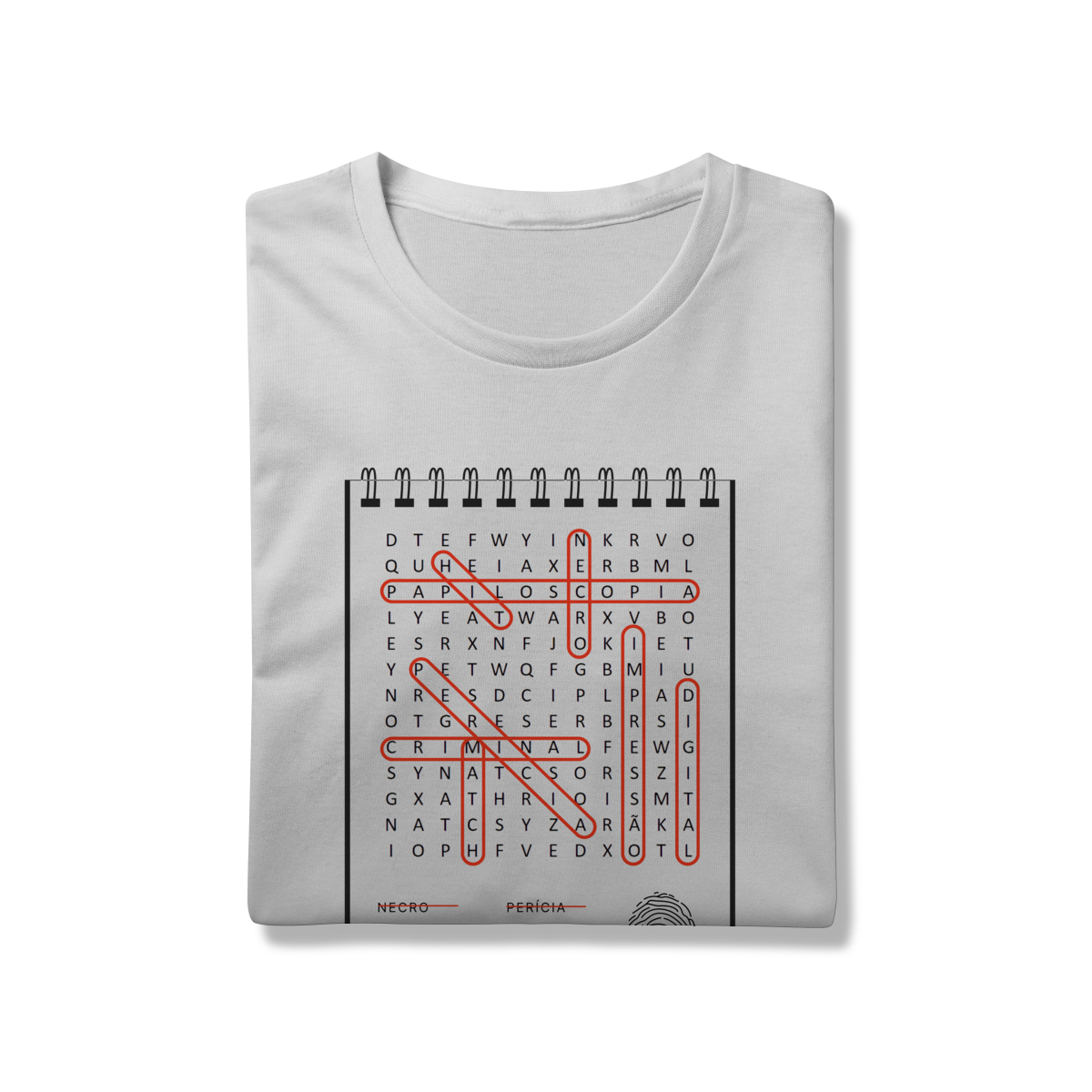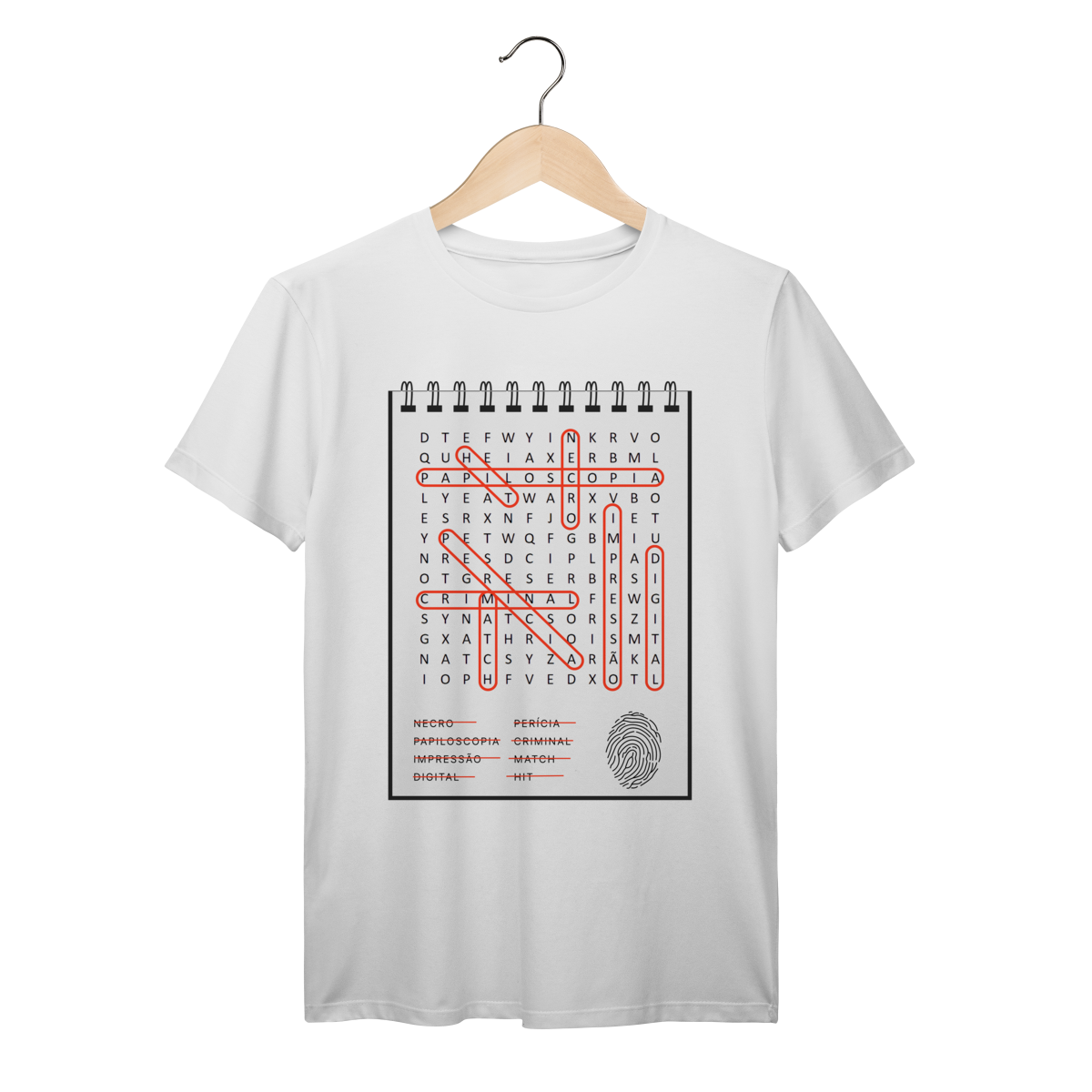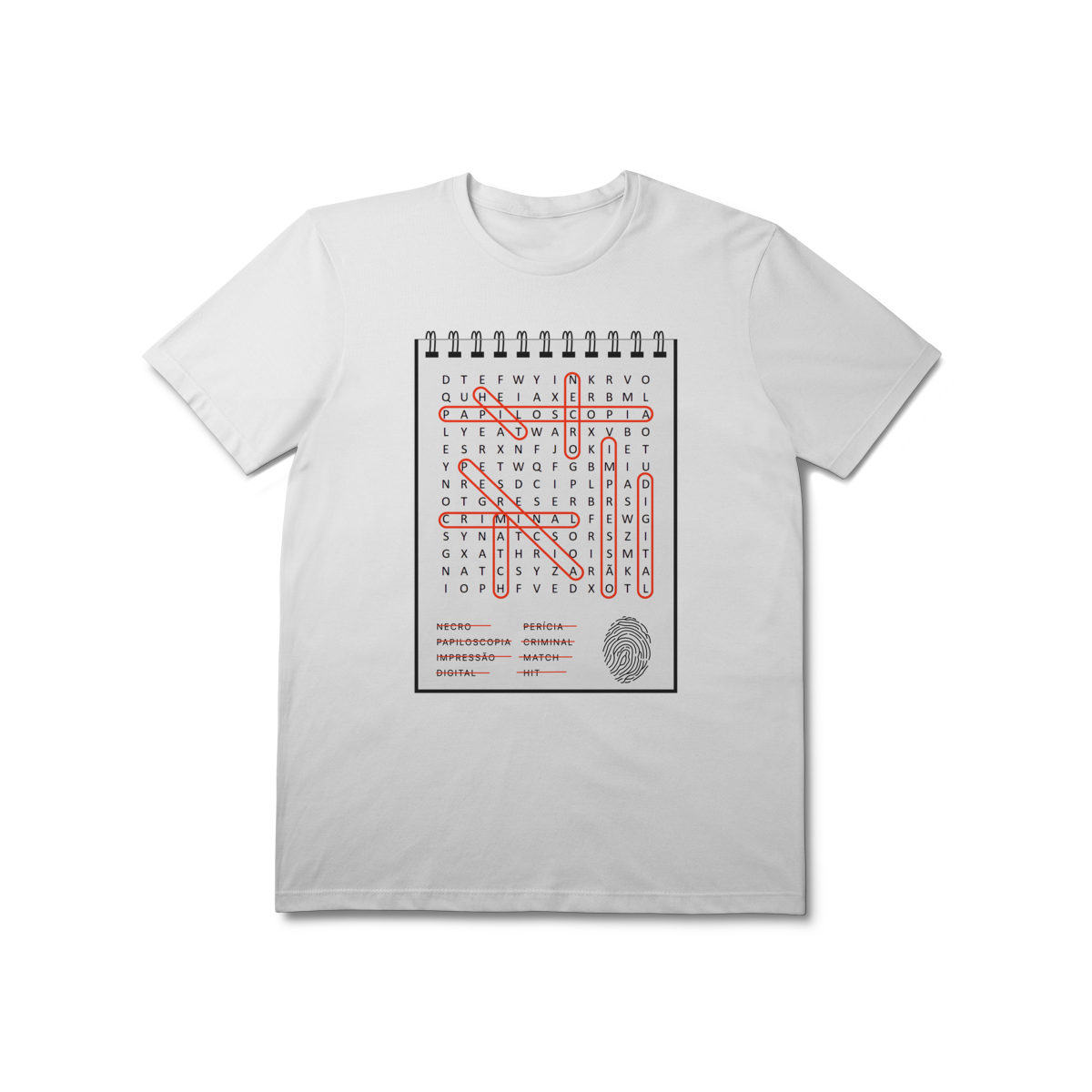 Uma peça única que une estética e ciência: nossa camiseta apresenta uma estampa em formato de caça palavras, com termos emblemáticos da identificação por impressões digitais.