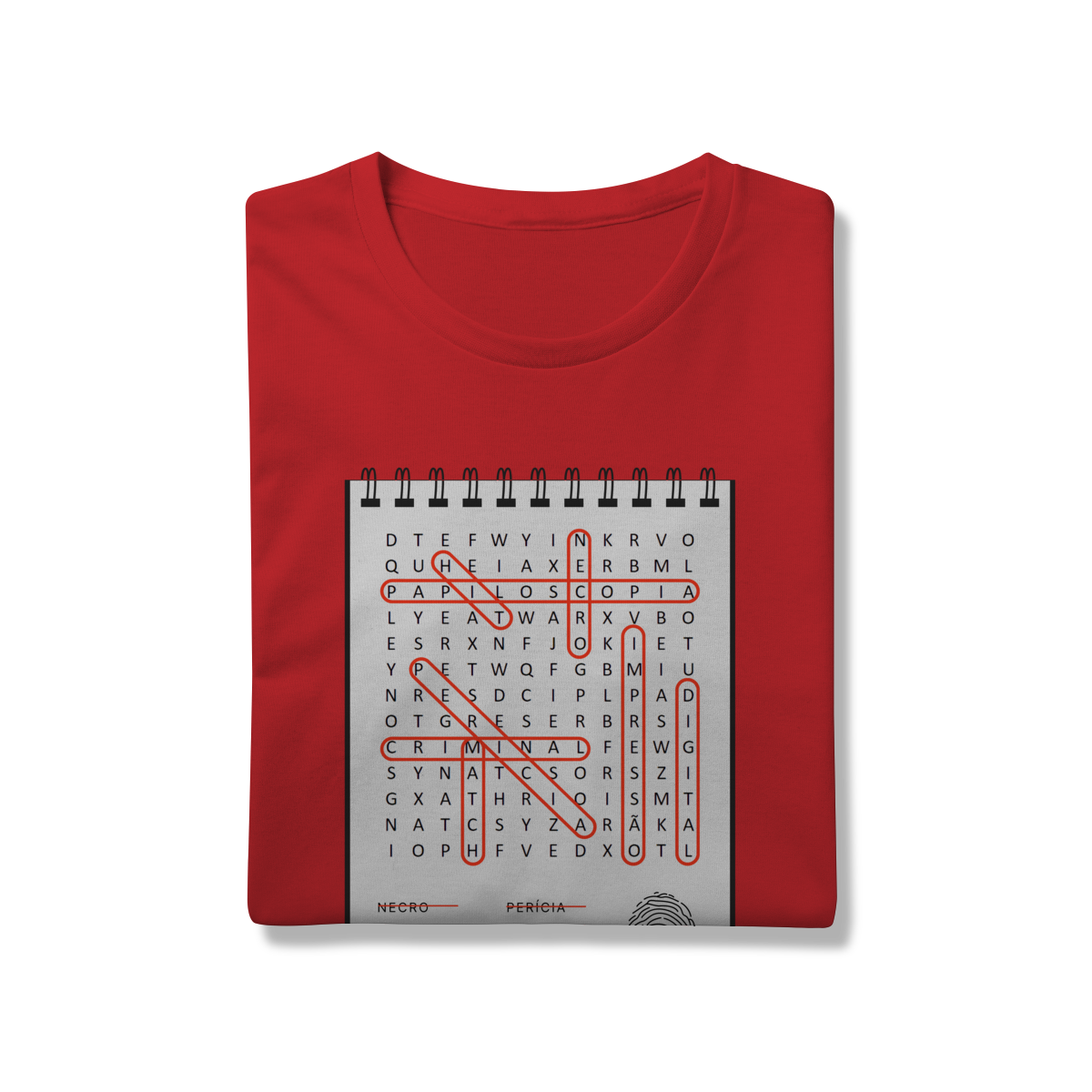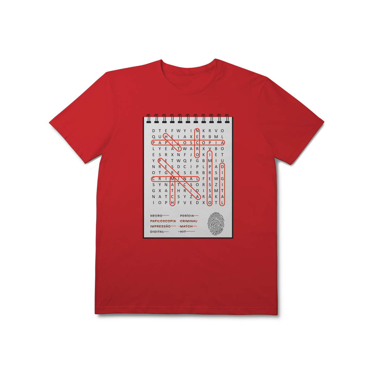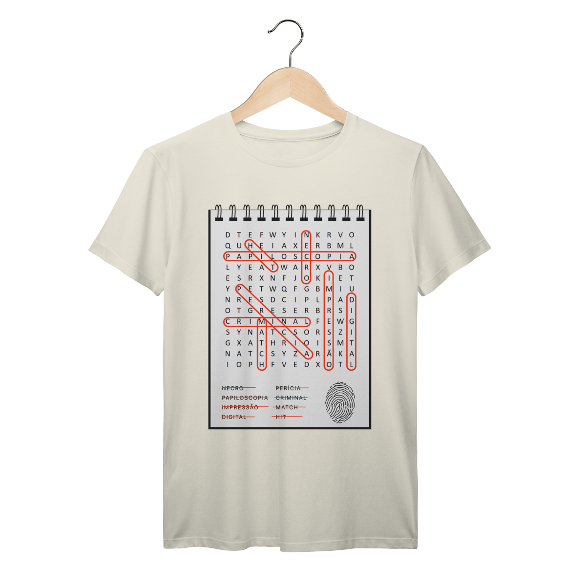 Uma peça única que une estética e ciência: nossa camiseta apresenta uma estampa em formato de caça palavras, com termos emblemáticos da identificação por impressões digitais.