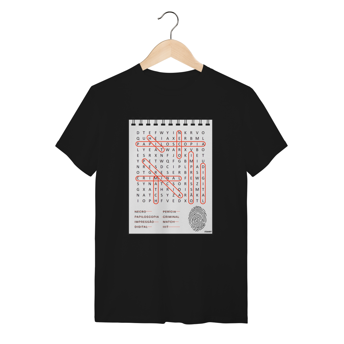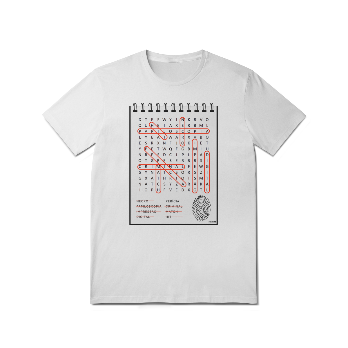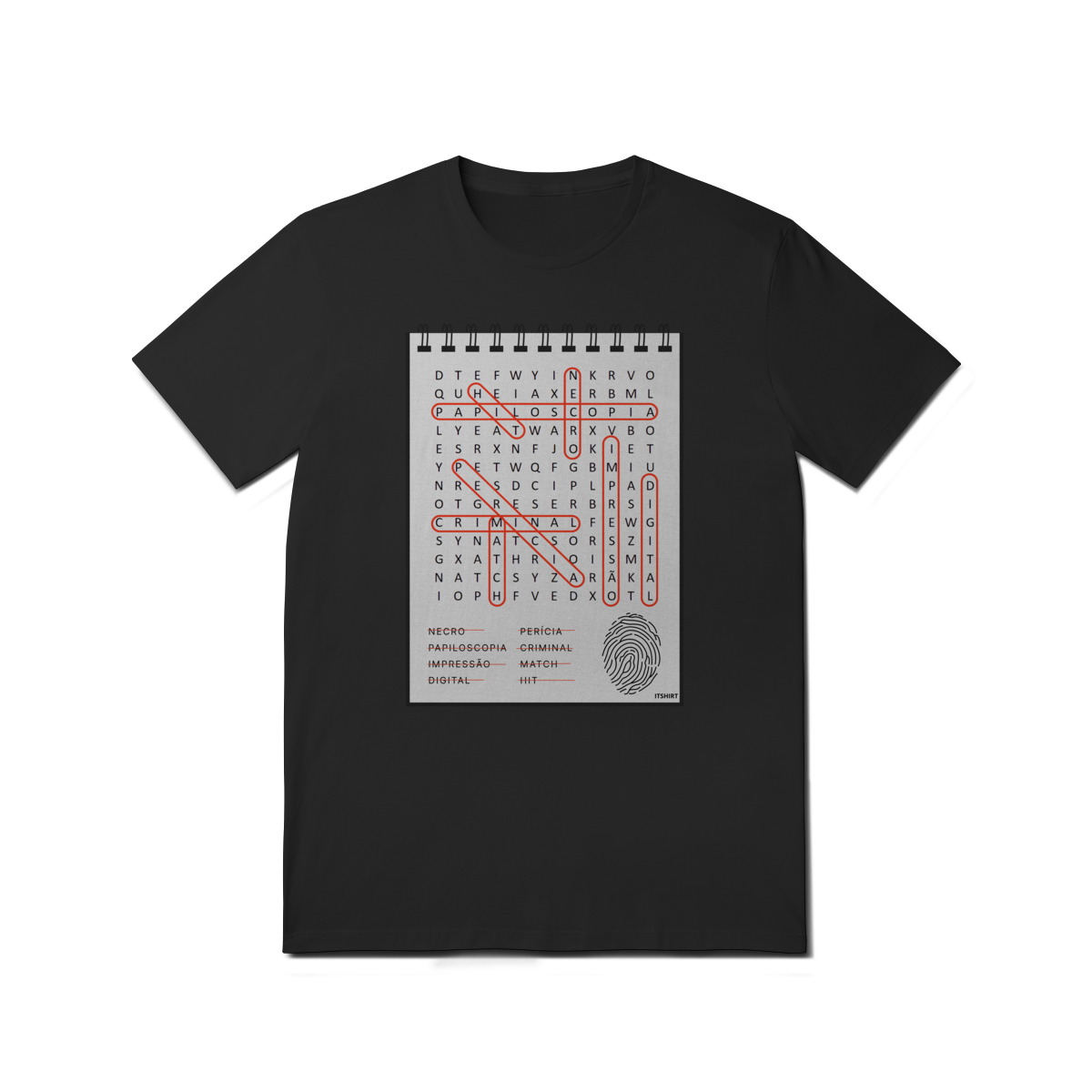 Uma peça única que une estética e ciência: nossa camiseta apresenta uma estampa em formato de caça palavras, com termos emblemáticos da identificação por impressões digitais.