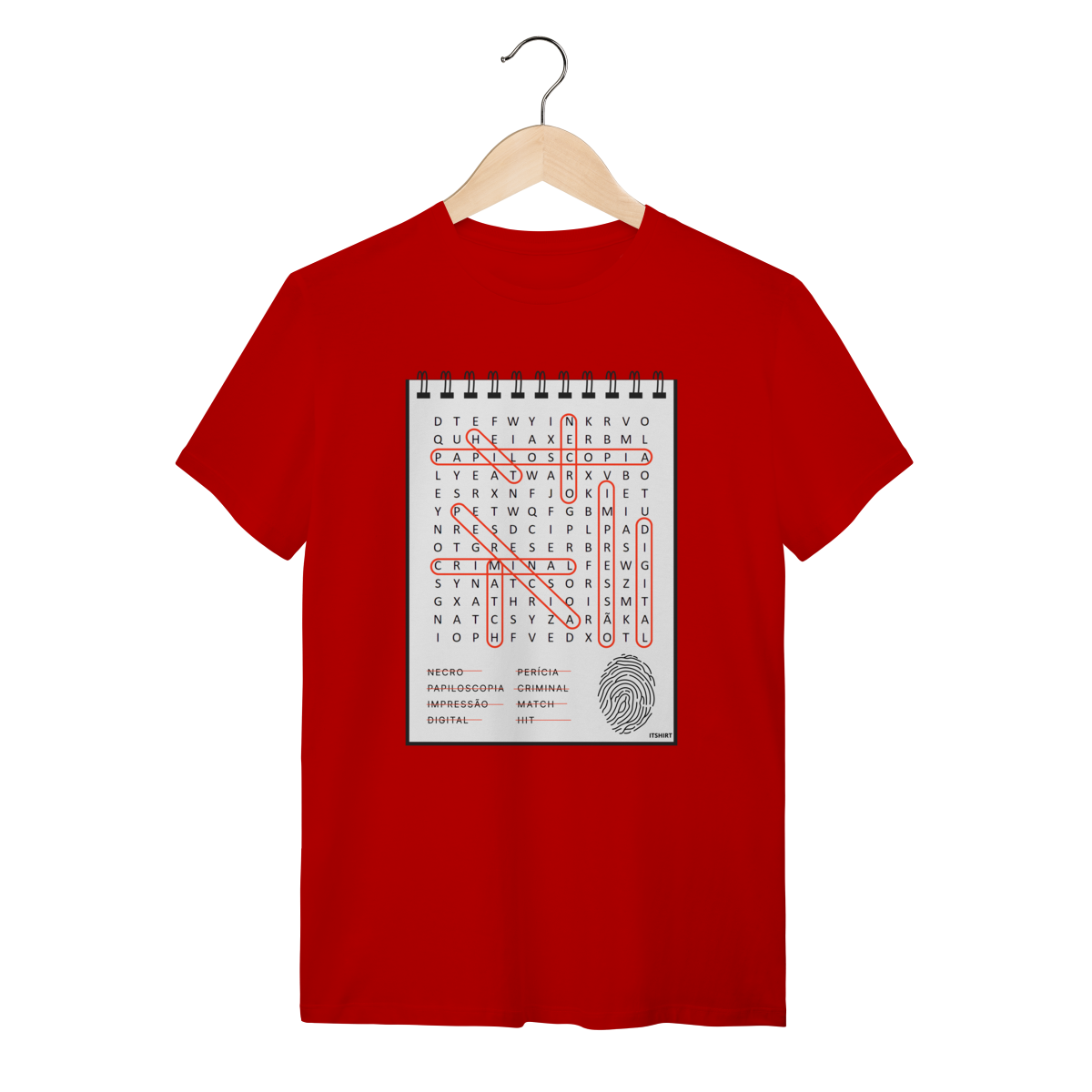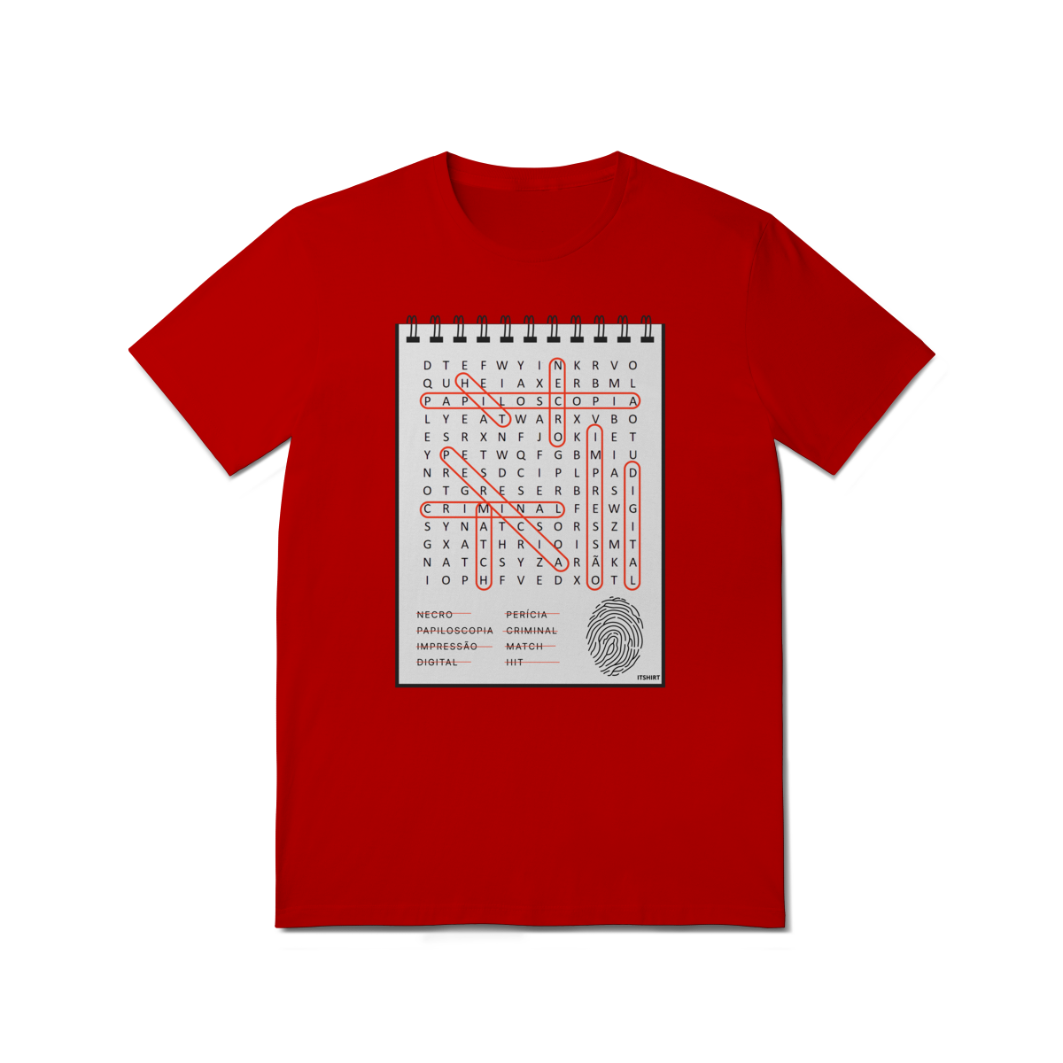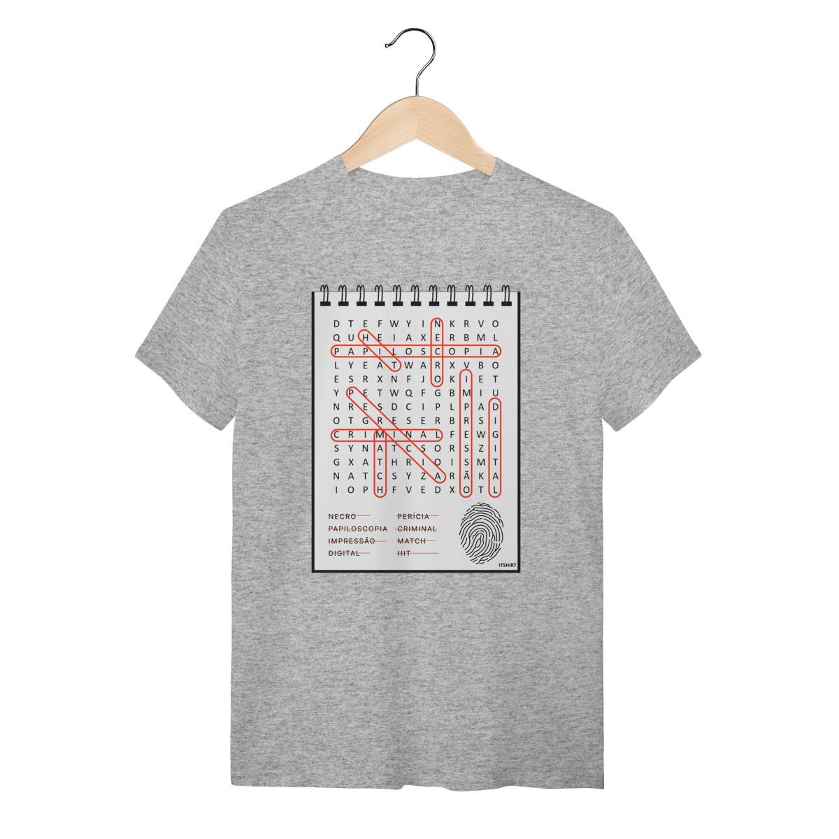 Uma peça única que une estética e ciência: nossa camiseta apresenta uma estampa em formato de caça palavras, com termos emblemáticos da identificação por impressões digitais.