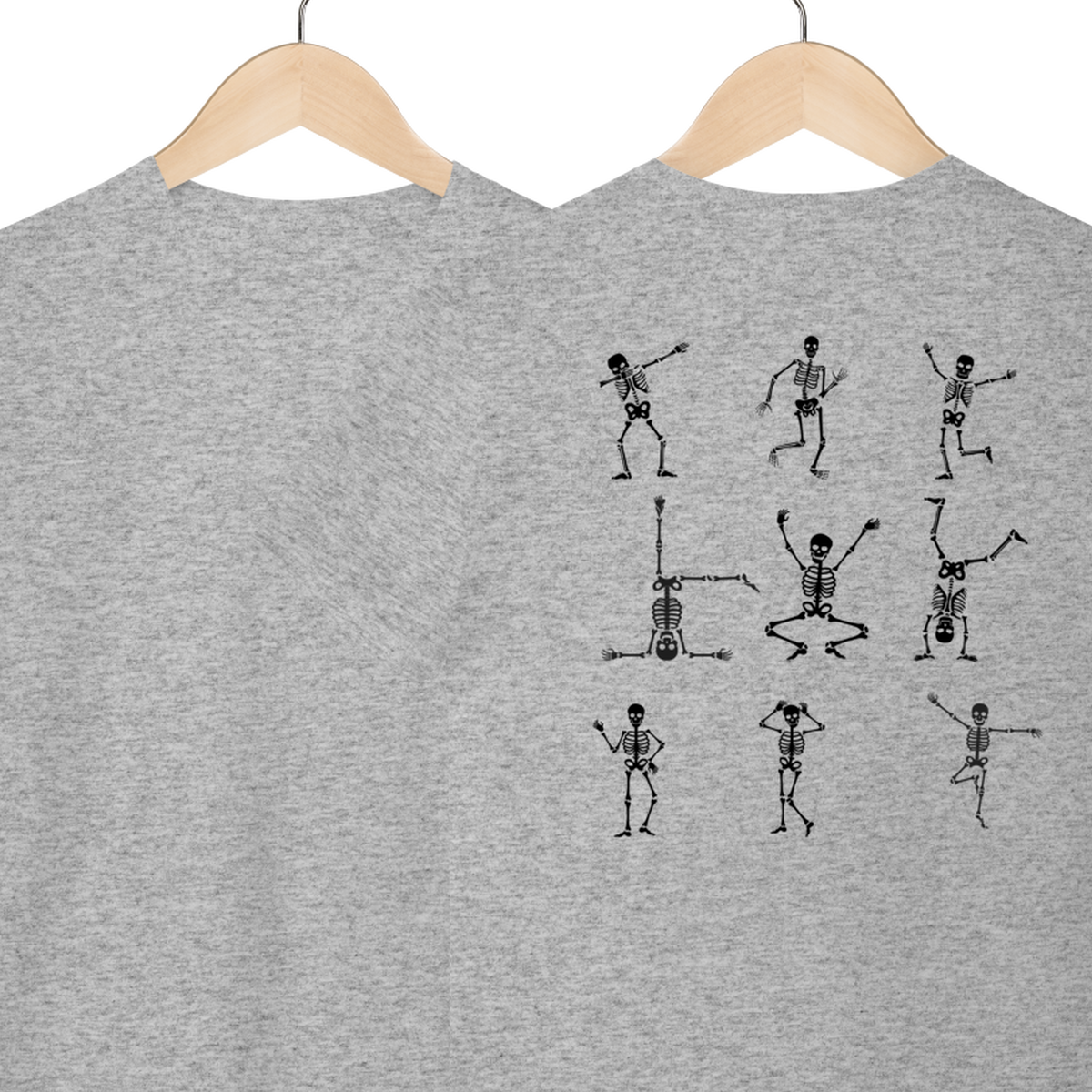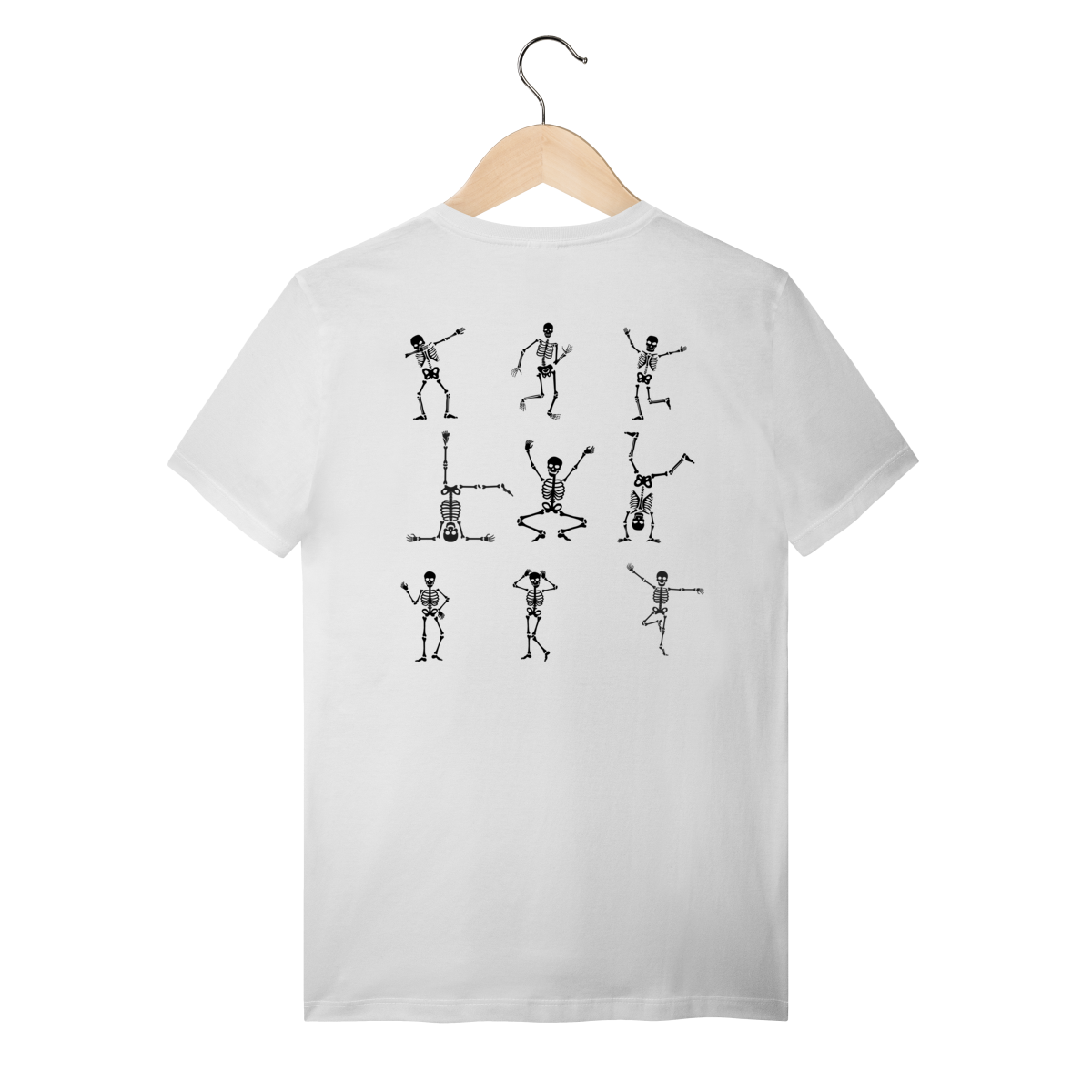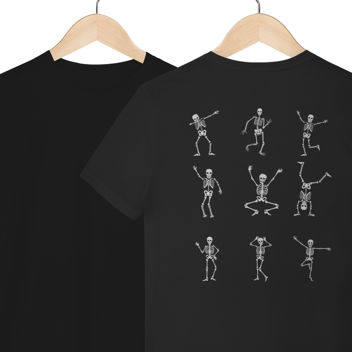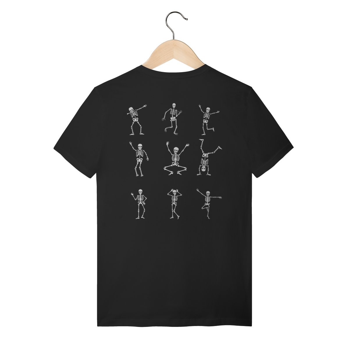 Leve seu visual para outro plano com esta camiseta que mistura irreverência e atitude: uma caveirinha em destaque frontal, acompanhada de várias outras dançando nas costas — uma composição gráfica que une humor, arte sombria e estilo descolado.