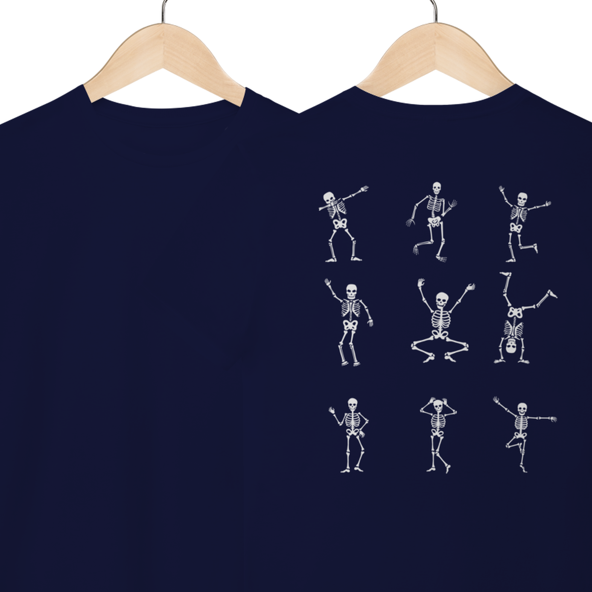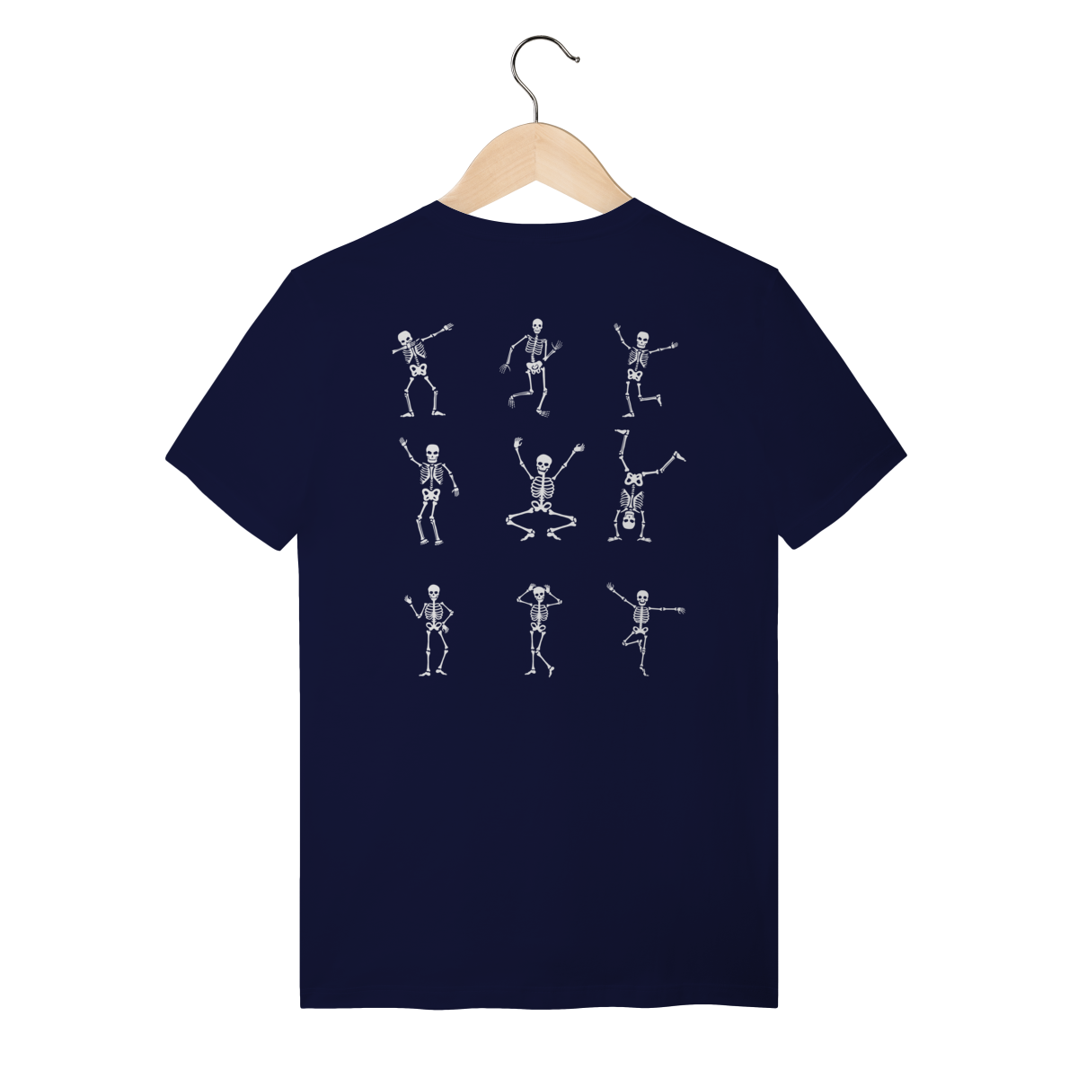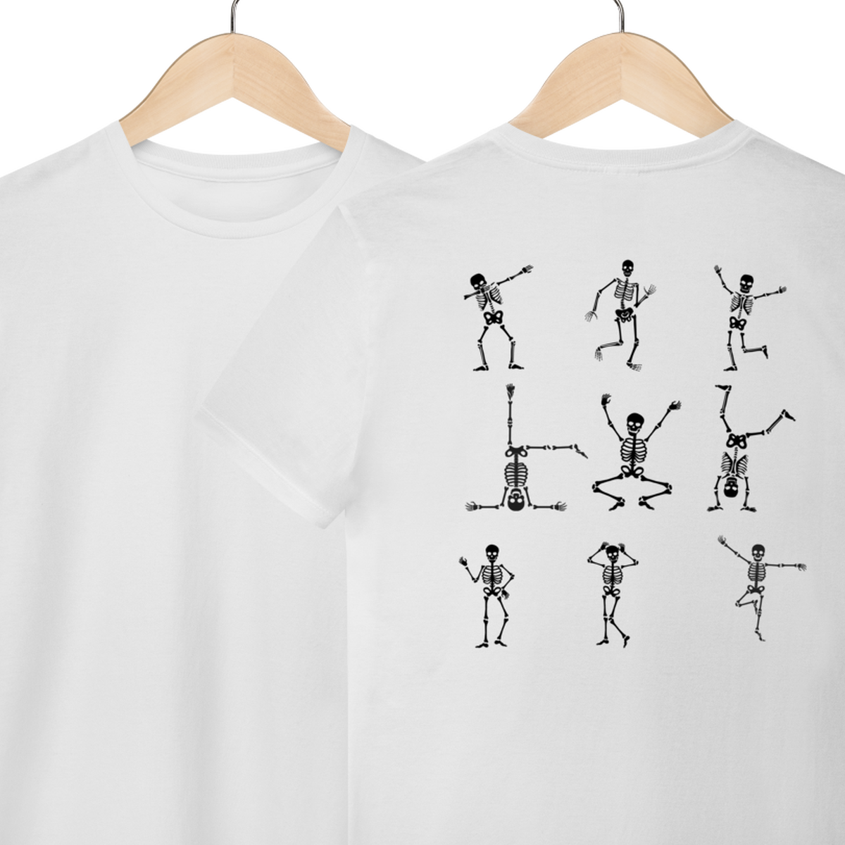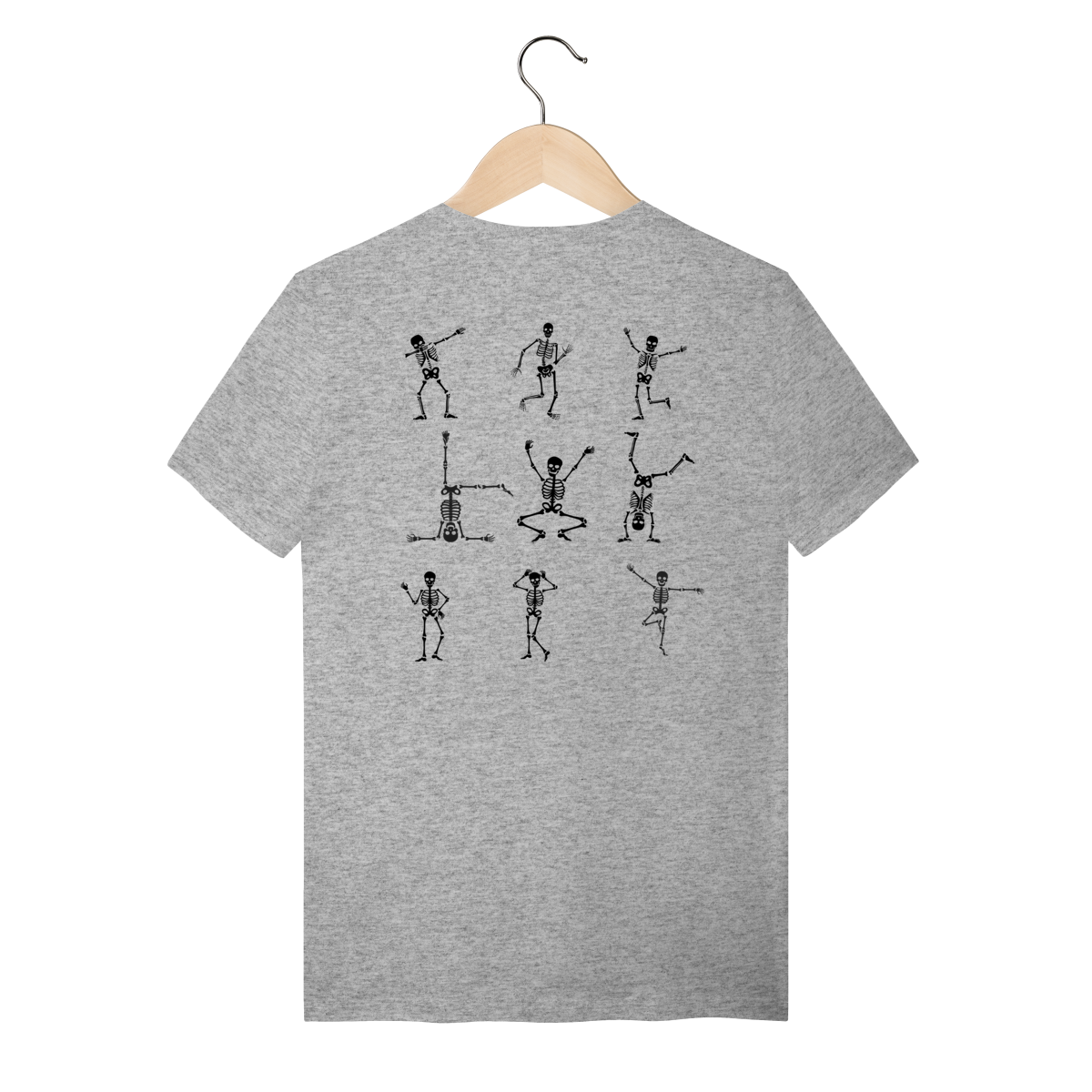 Leve seu visual para outro plano com esta camiseta que mistura irreverência e atitude: uma caveirinha em destaque frontal, acompanhada de várias outras dançando nas costas — uma composição gráfica que une humor, arte sombria e estilo descolado.