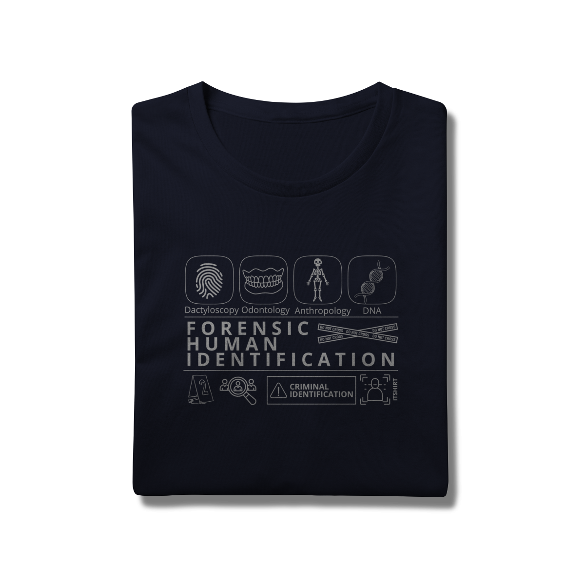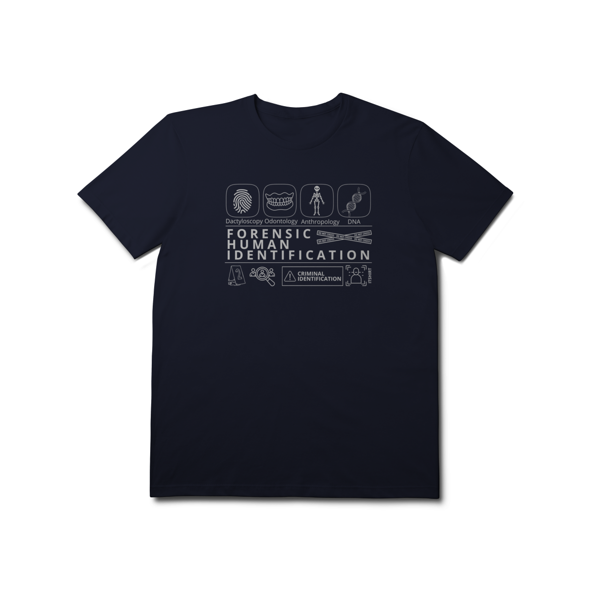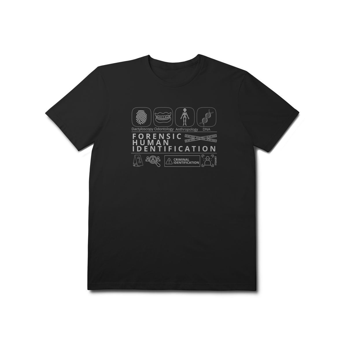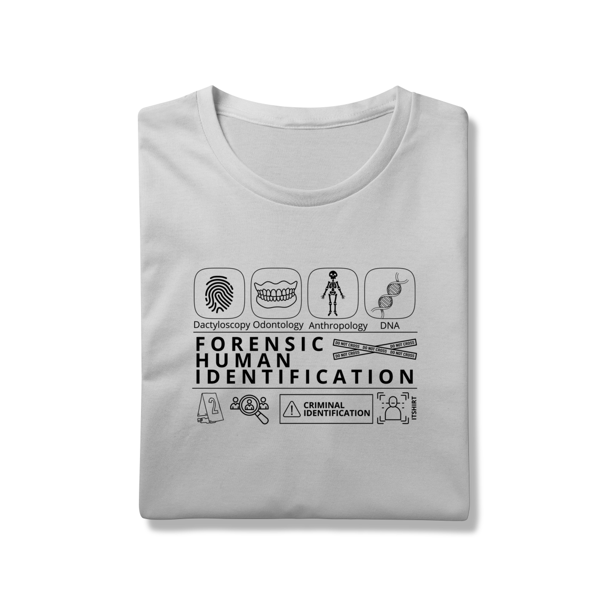 Esta camiseta tem uma estampa inspirada nos principais métodos forenses: papiloscopia, antropologia, odontologia legal e DNA — formando um visual que homenageia a precisão científico-forense. Design exclusivo e significativo: reúne os campos mais relevantes da perícia de identificação, celebrando cada técnica como parte essencial da investigação criminal e humana.