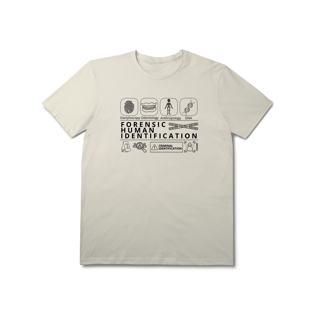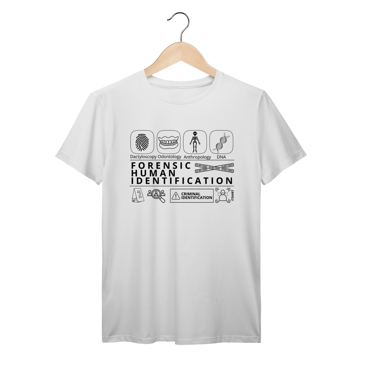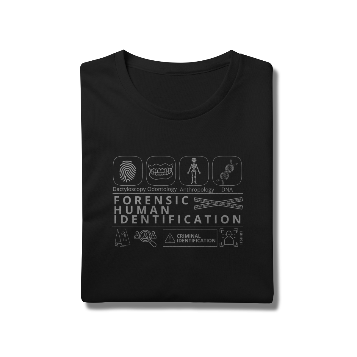 Esta camiseta tem uma estampa inspirada nos principais métodos forenses: papiloscopia, antropologia, odontologia legal e DNA — formando um visual que homenageia a precisão científico-forense. Design exclusivo e significativo: reúne os campos mais relevantes da perícia de identificação, celebrando cada técnica como parte essencial da investigação criminal e humana.