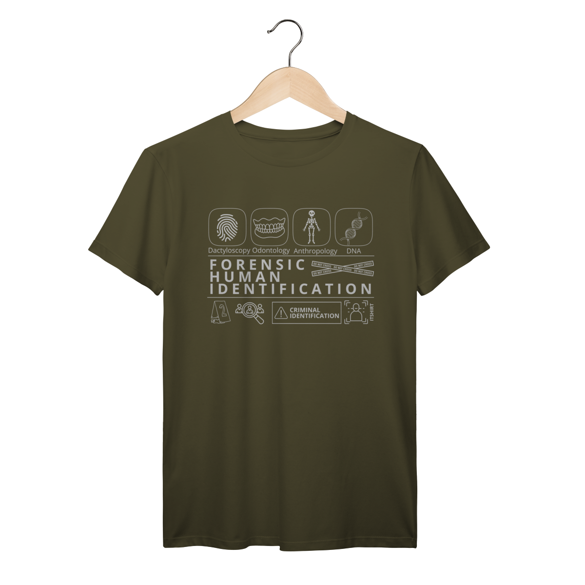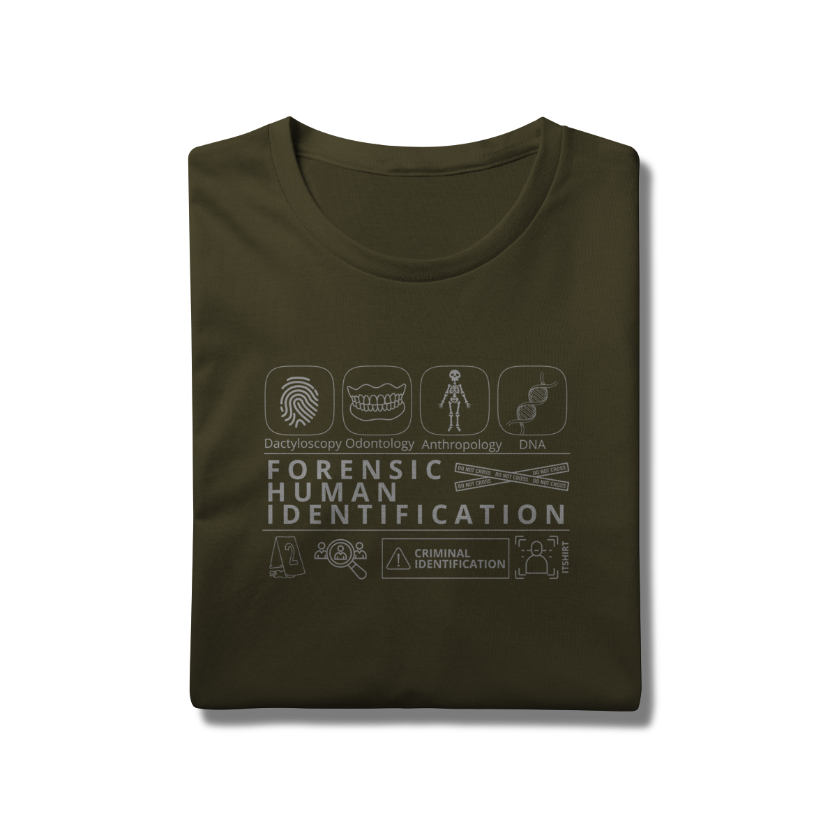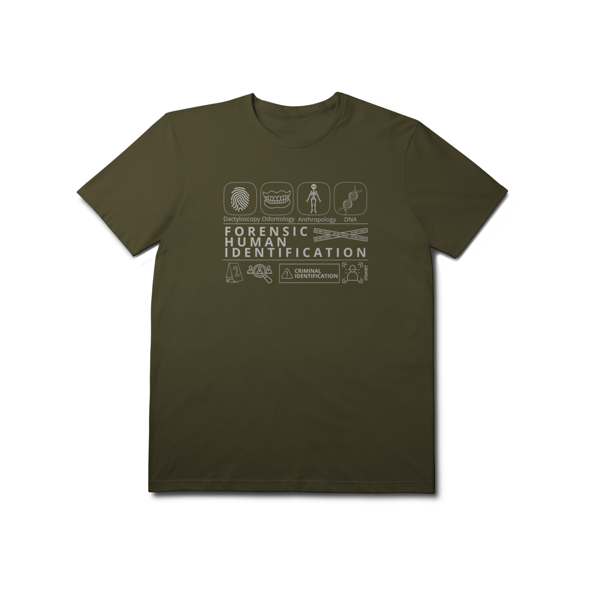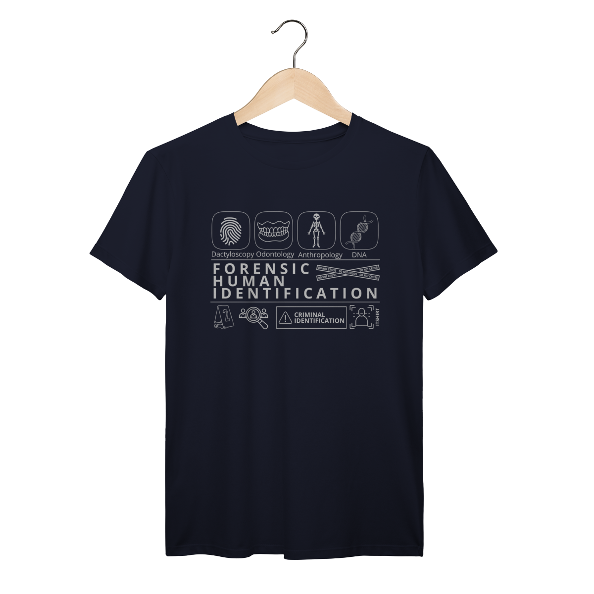 Esta camiseta tem uma estampa inspirada nos principais métodos forenses: papiloscopia, antropologia, odontologia legal e DNA — formando um visual que homenageia a precisão científico-forense. Design exclusivo e significativo: reúne os campos mais relevantes da perícia de identificação, celebrando cada técnica como parte essencial da investigação criminal e humana.