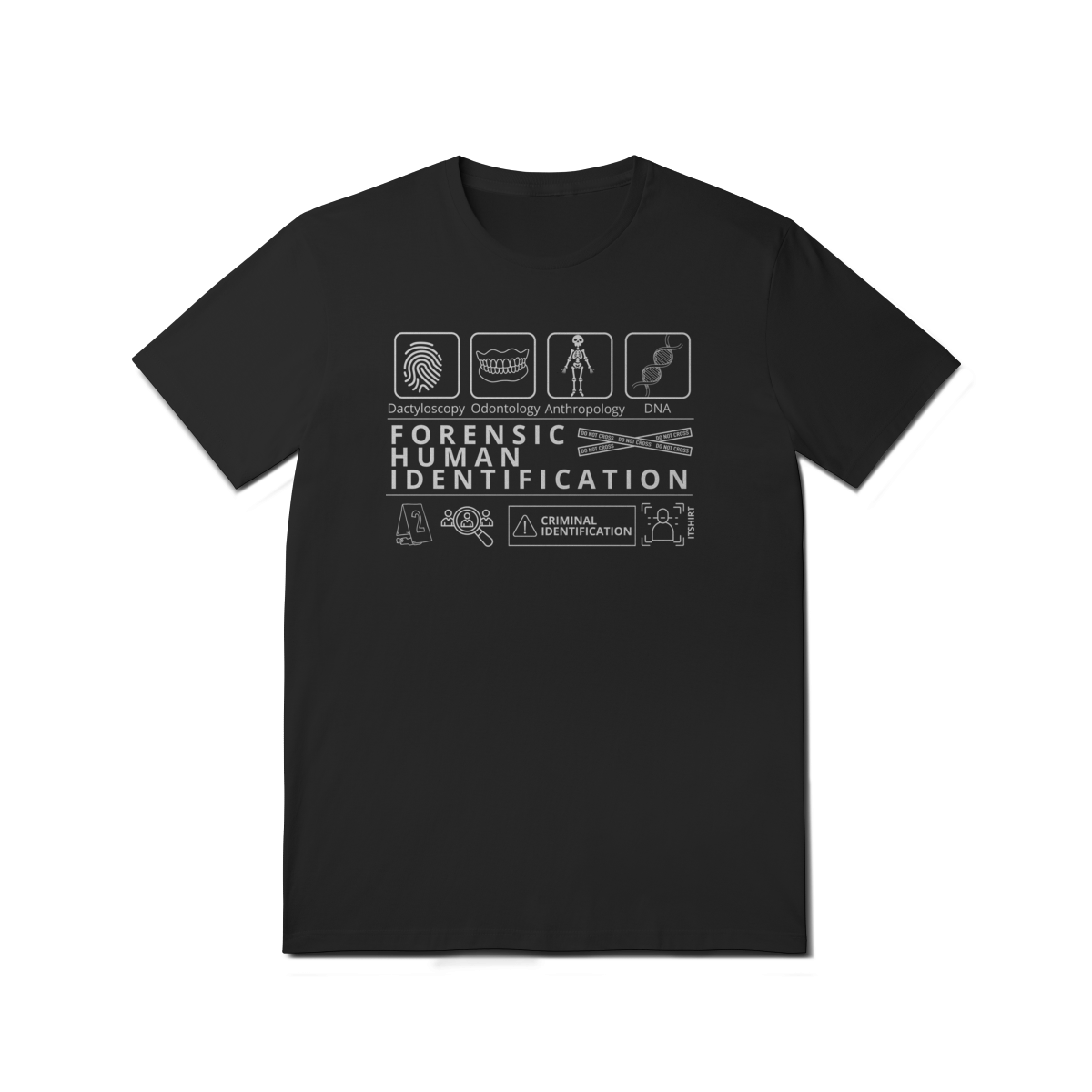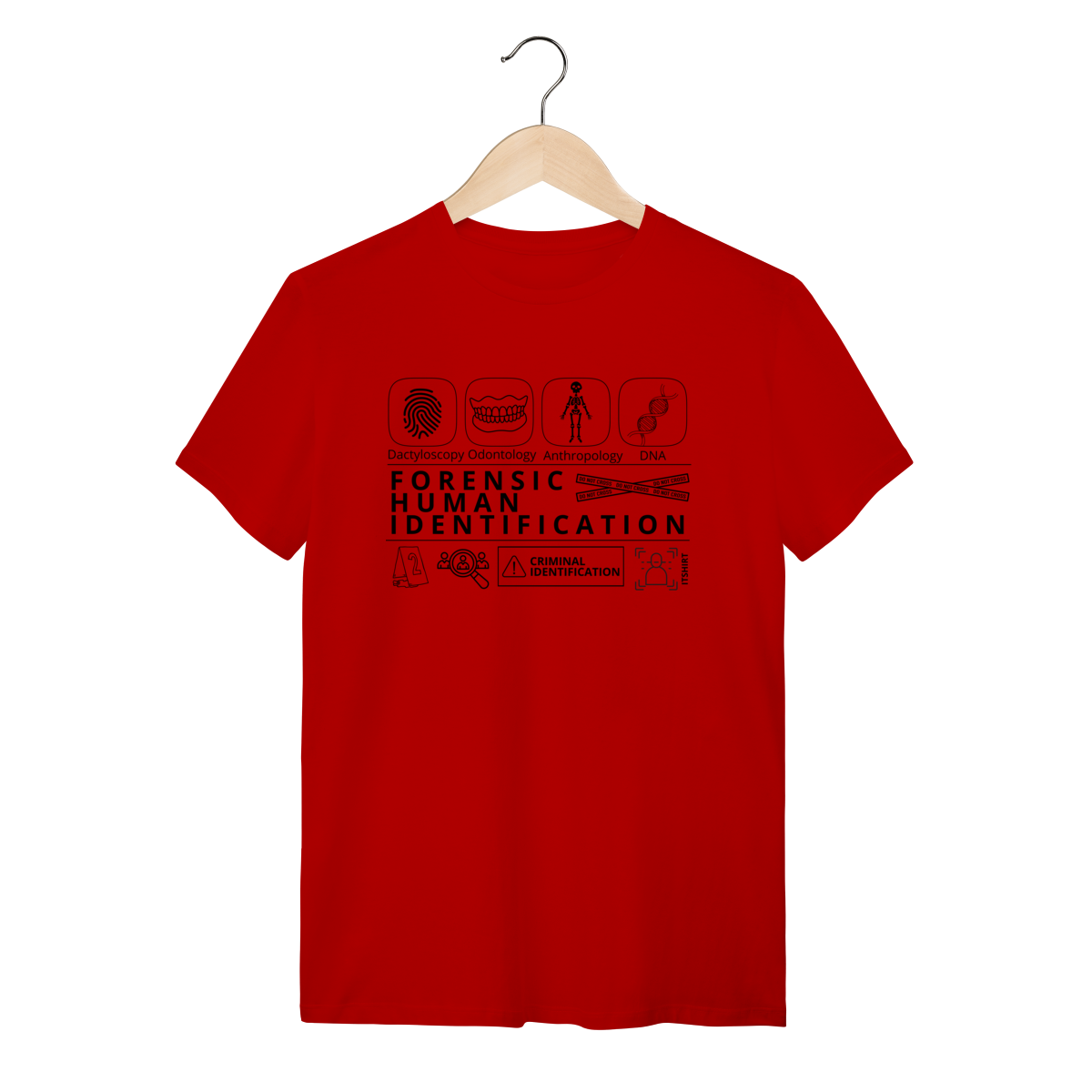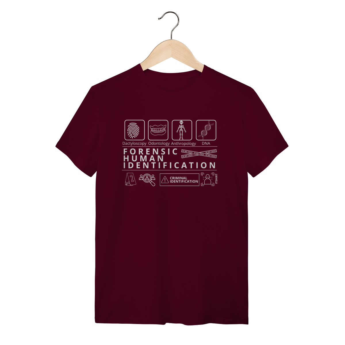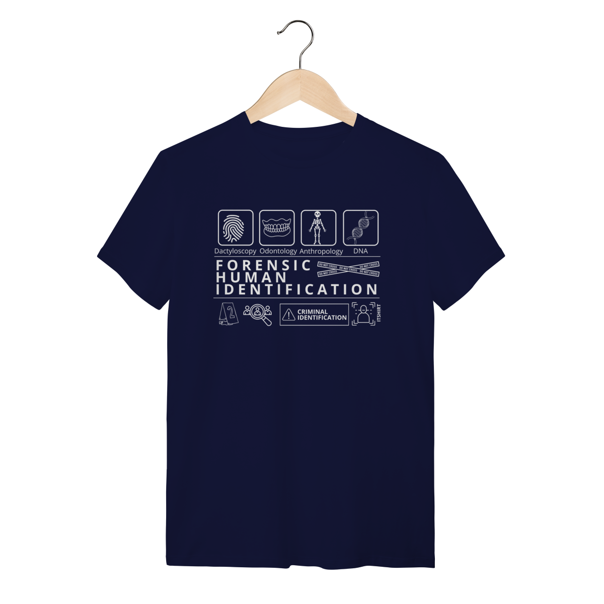 Esta camiseta tem uma estampa inspirada nos principais métodos forenses: papiloscopia, antropologia, odontologia legal e DNA — formando um visual que homenageia a precisão científico-forense. Design exclusivo e significativo: reúne os campos mais relevantes da perícia de identificação, celebrando cada técnica como parte essencial da investigação criminal e humana.