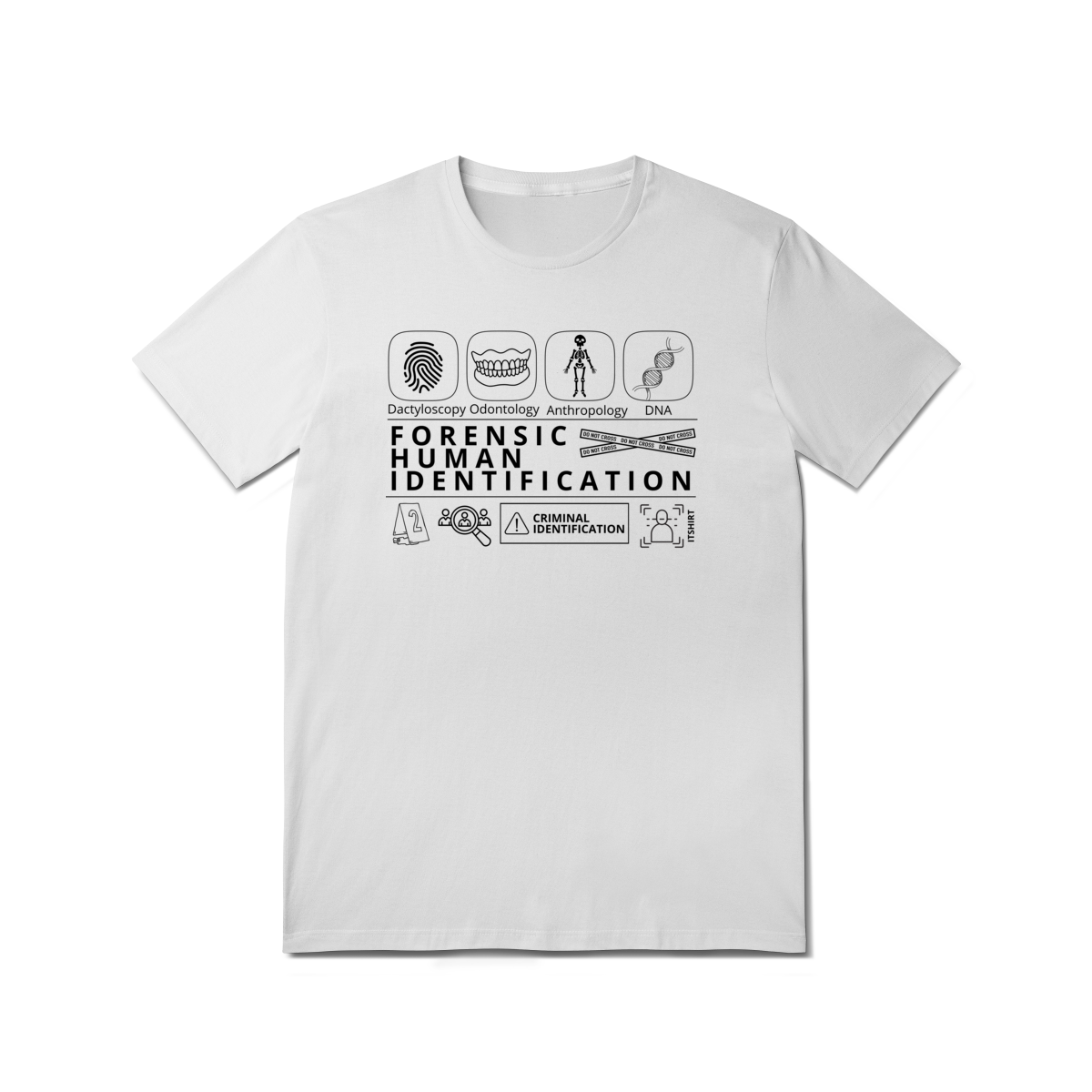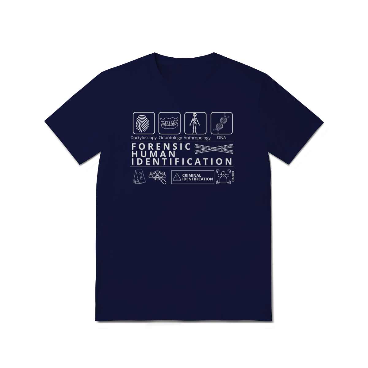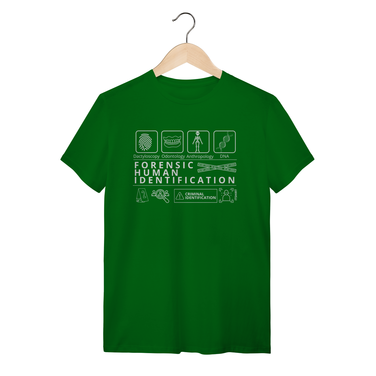 Esta camiseta tem uma estampa inspirada nos principais métodos forenses: papiloscopia, antropologia, odontologia legal e DNA — formando um visual que homenageia a precisão científico-forense. Design exclusivo e significativo: reúne os campos mais relevantes da perícia de identificação, celebrando cada técnica como parte essencial da investigação criminal e humana.