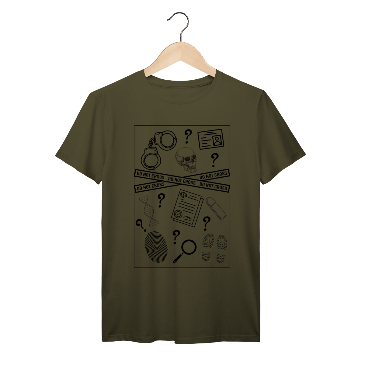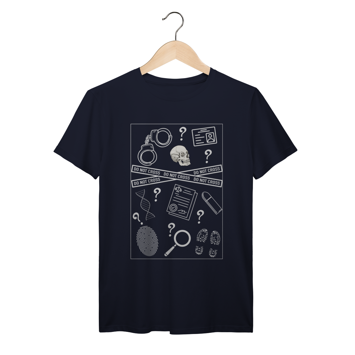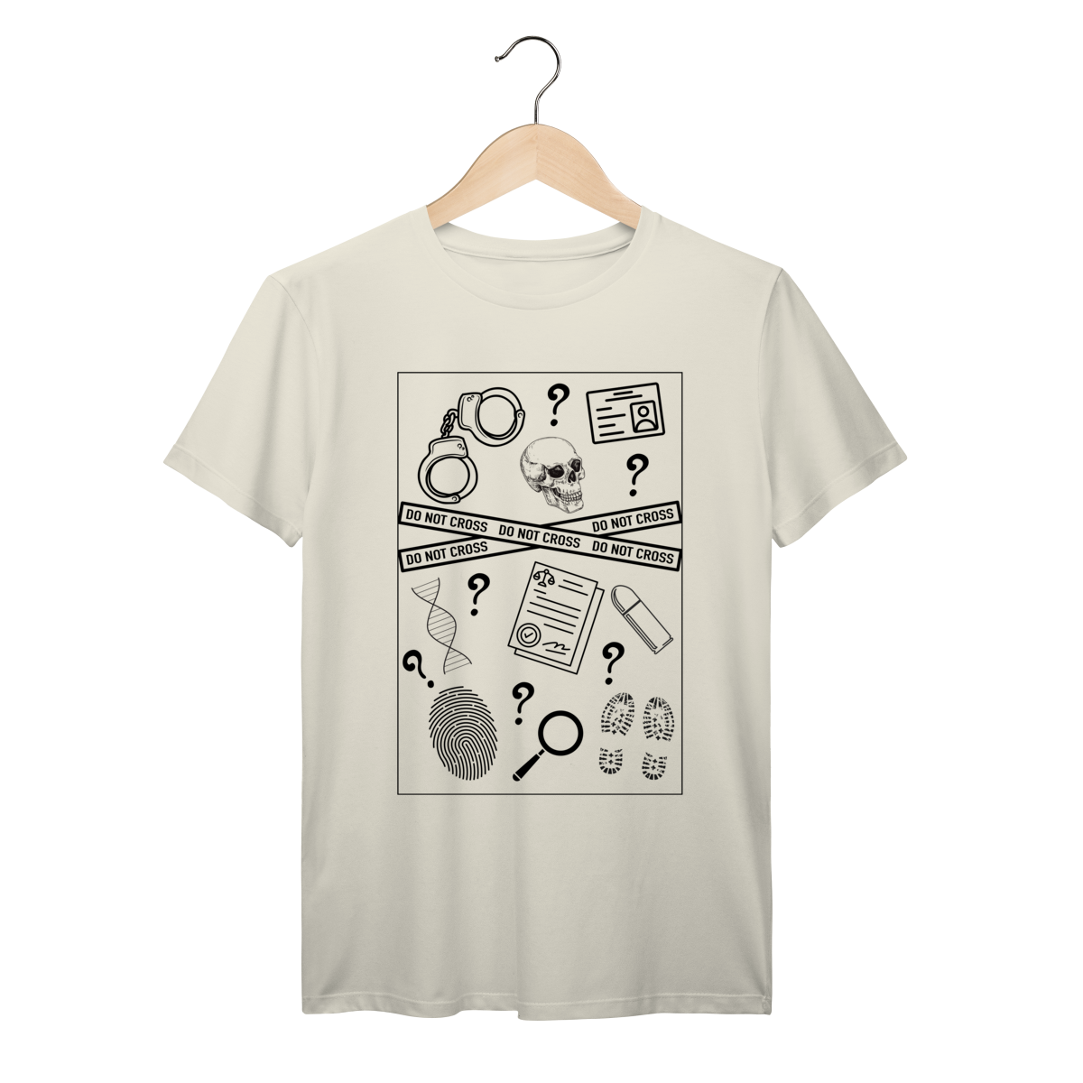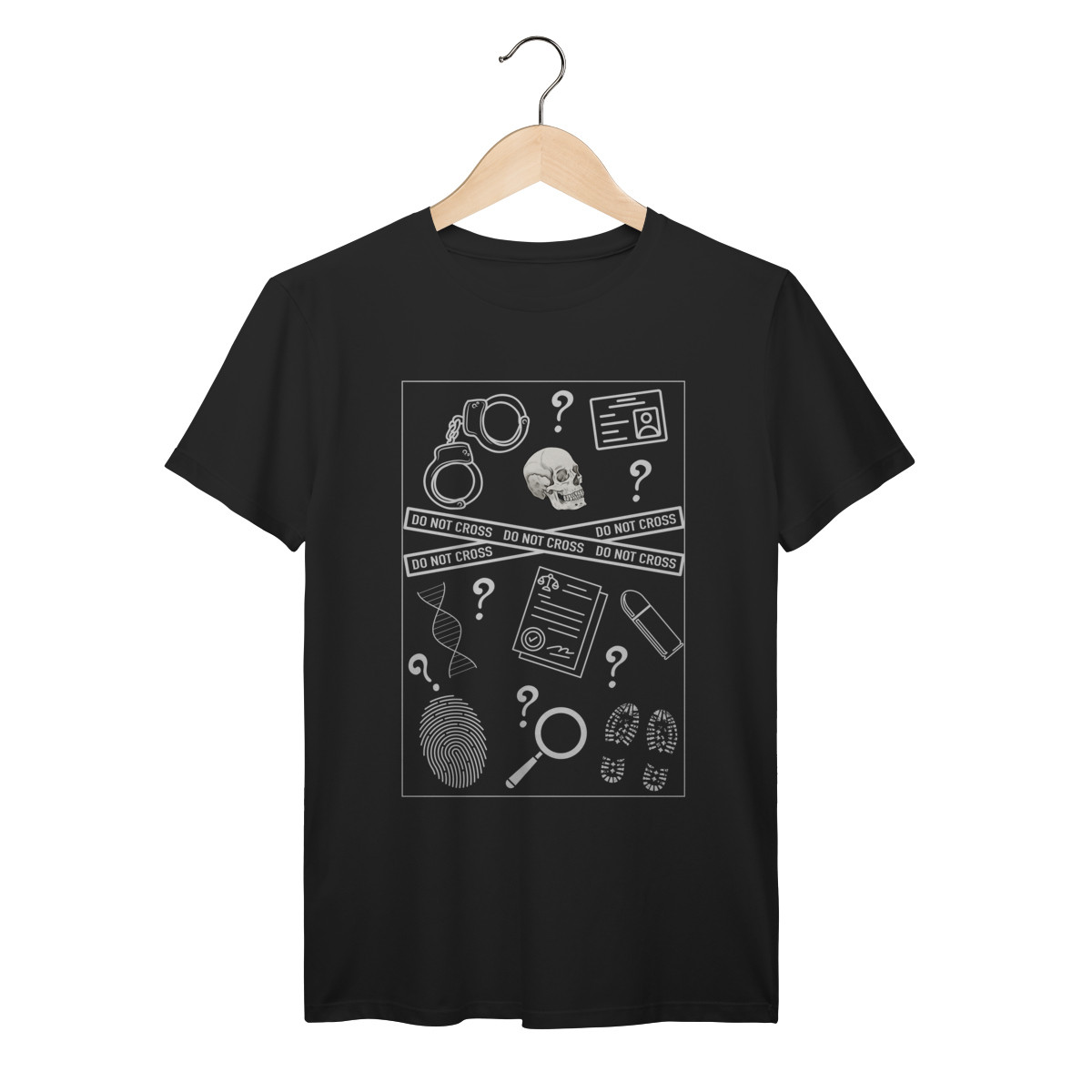 Desperte o investigador que existe em você! Esta camiseta traz estampas icônicas inspiradas em cenas de crime: fita zebrada de isolamento, marcador de evidência, cápsula de bala, pegada, lupa, impressões digitais e demais símbolos que remetem ao rigor e à curiosidade da investigação forense.