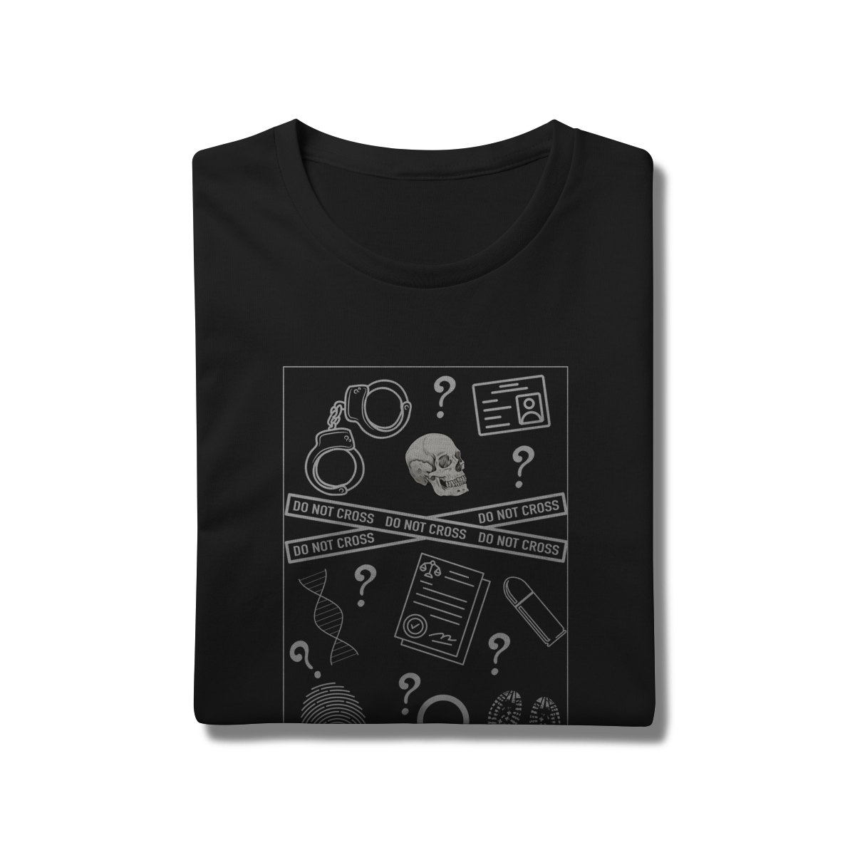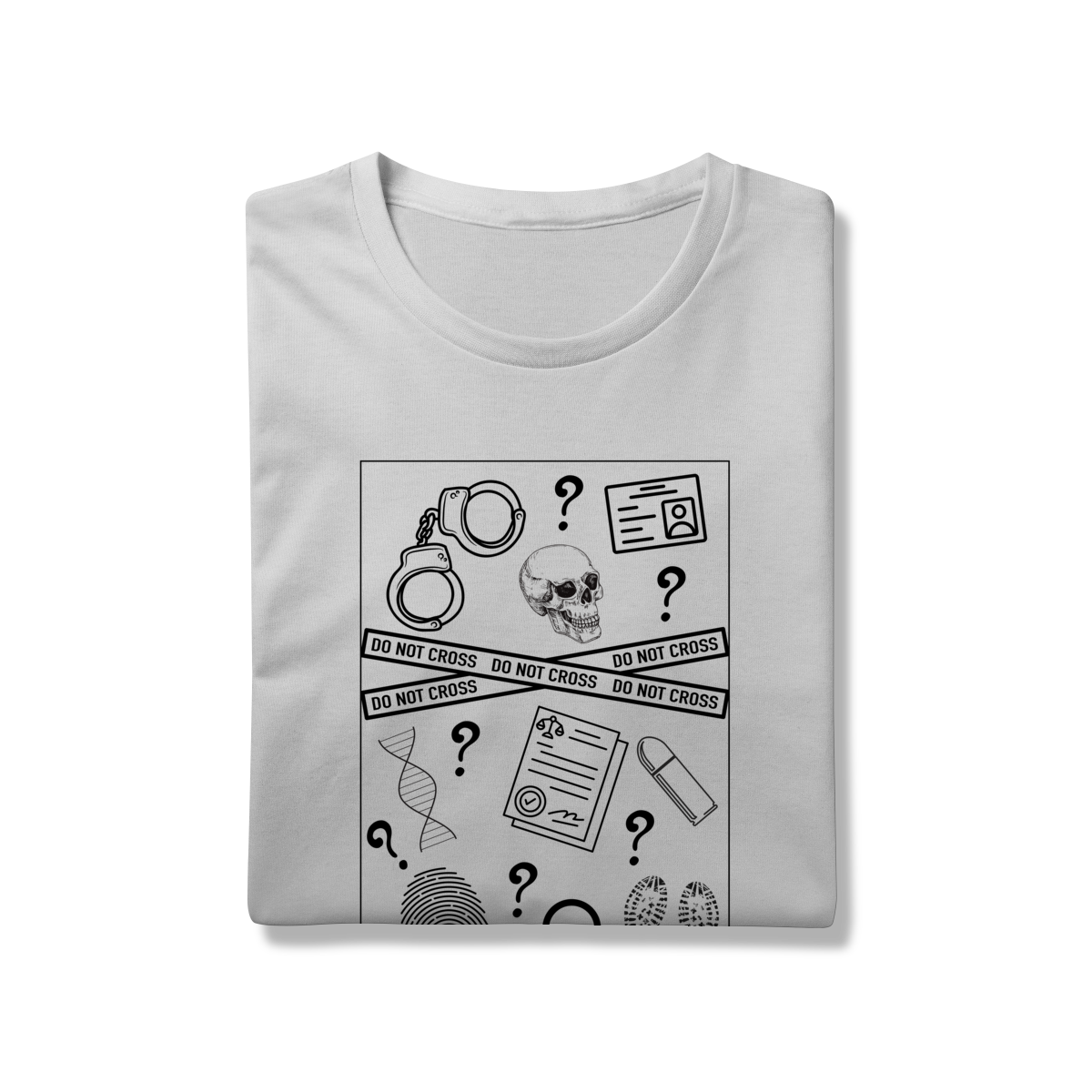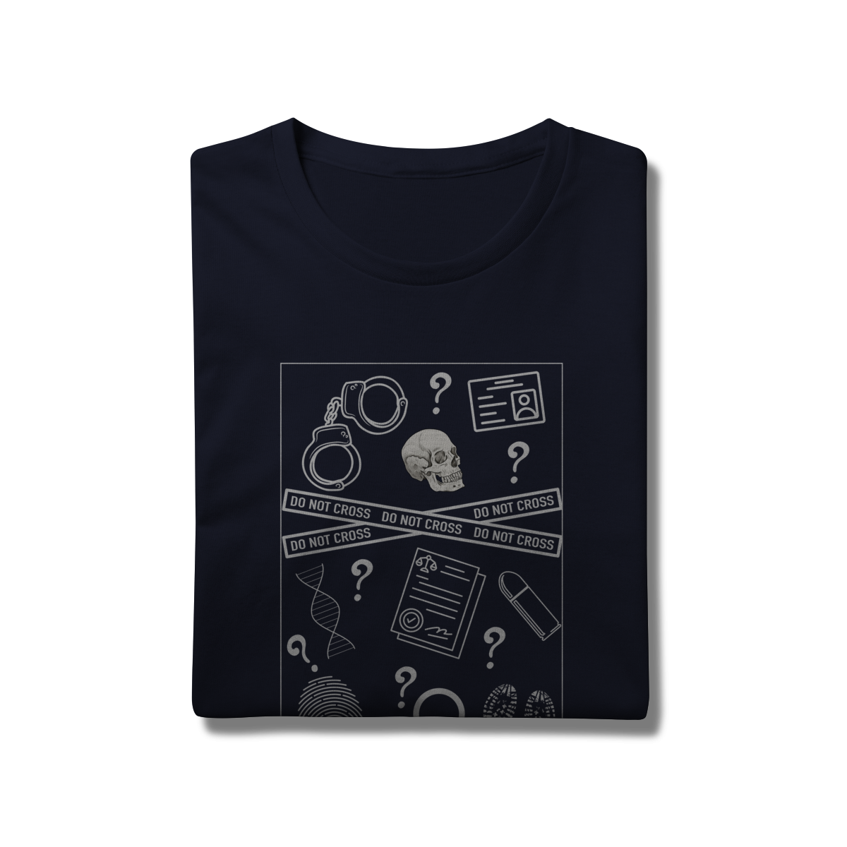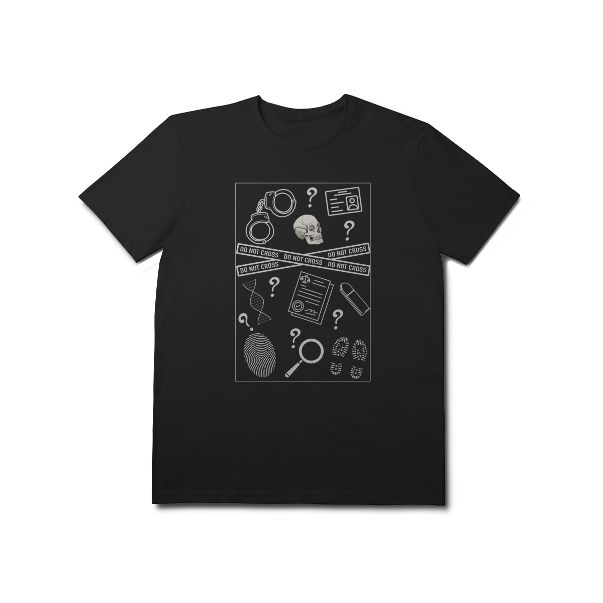 Desperte o investigador que existe em você! Esta camiseta traz estampas icônicas inspiradas em cenas de crime: fita zebrada de isolamento, marcador de evidência, cápsula de bala, pegada, lupa, impressões digitais e demais símbolos que remetem ao rigor e à curiosidade da investigação forense.
