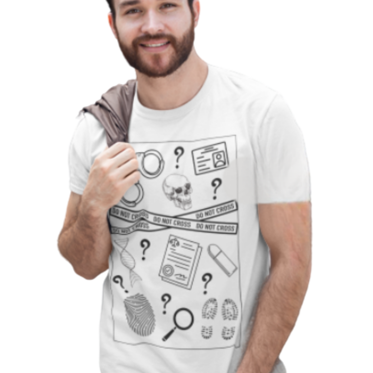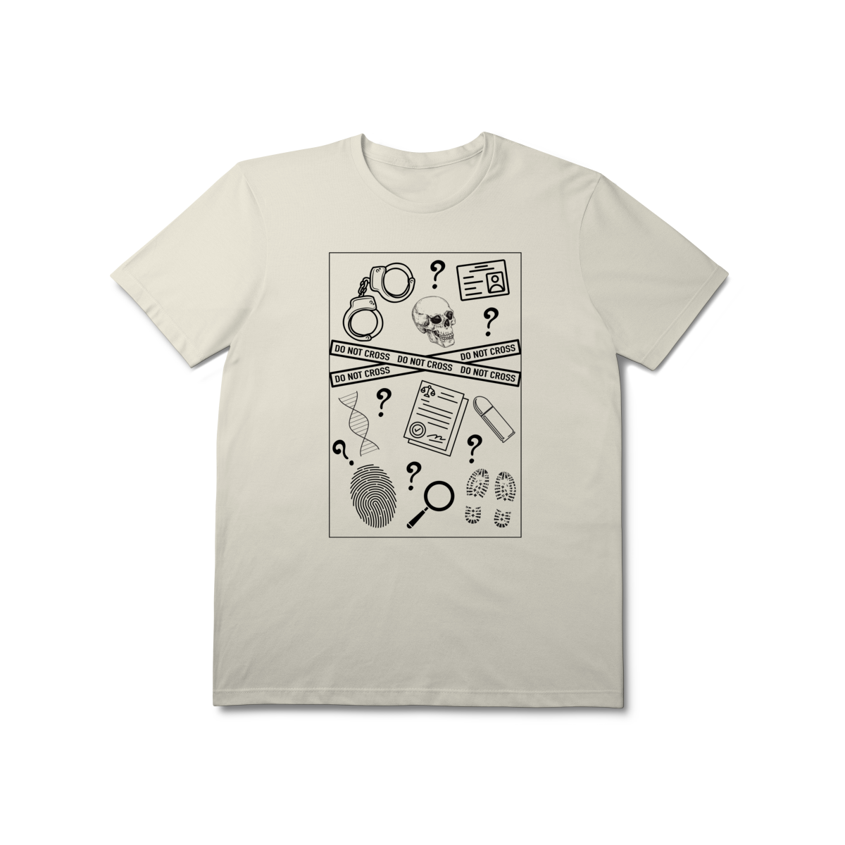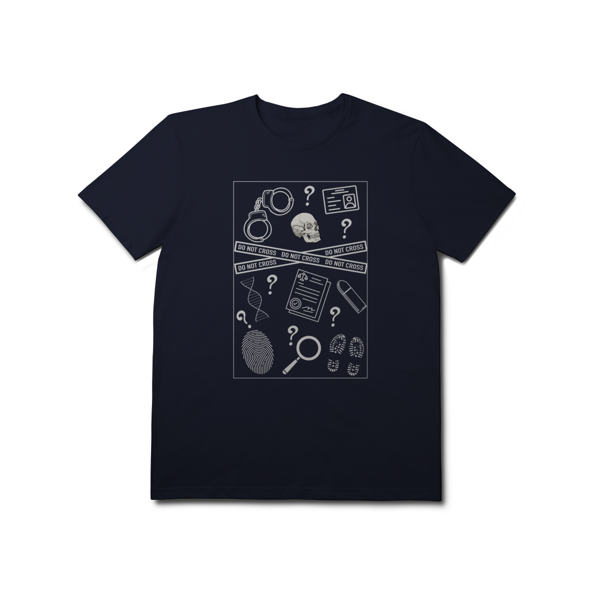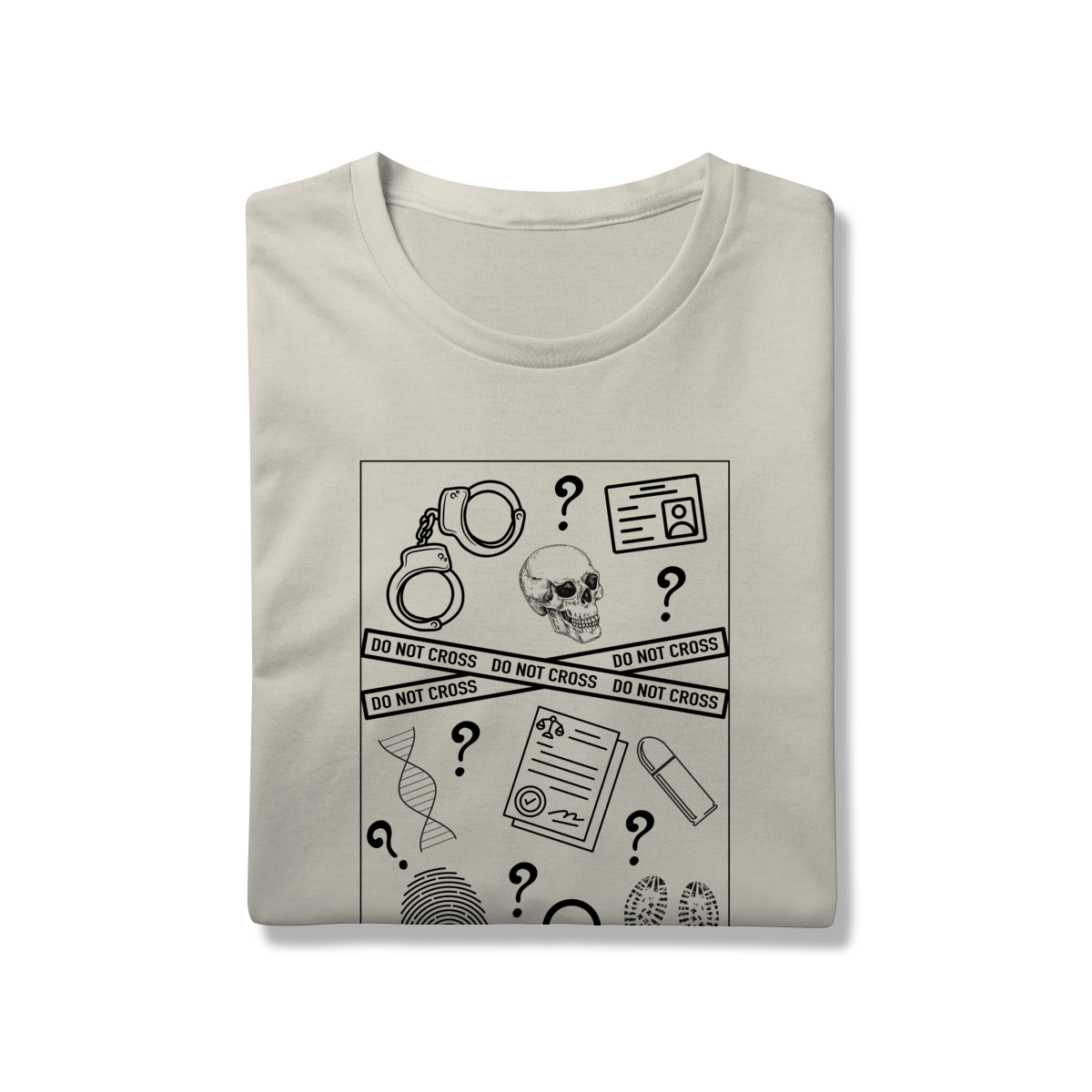 Desperte o investigador que existe em você! Esta camiseta traz estampas icônicas inspiradas em cenas de crime: fita zebrada de isolamento, marcador de evidência, cápsula de bala, pegada, lupa, impressões digitais e demais símbolos que remetem ao rigor e à curiosidade da investigação forense.