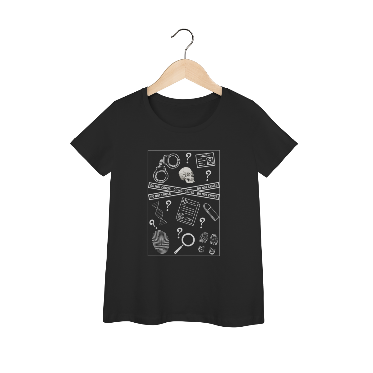 Desperte o investigador que existe em você! Esta camiseta traz estampas icônicas inspiradas em cenas de crime: fita zebrada de isolamento, marcador de evidência, cápsula de bala, pegada, lupa, impressões digitais e demais símbolos que remetem ao rigor e à curiosidade da investigação forense.
