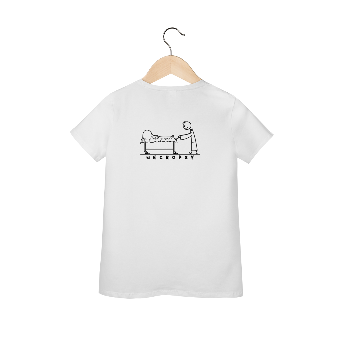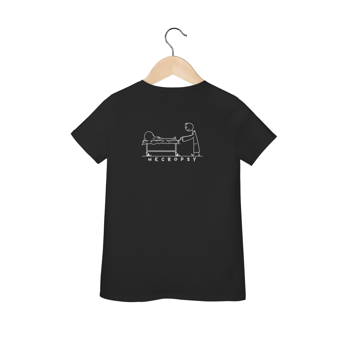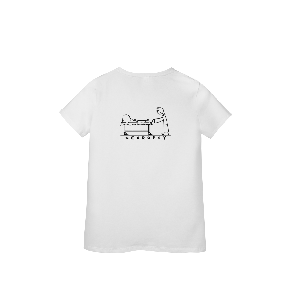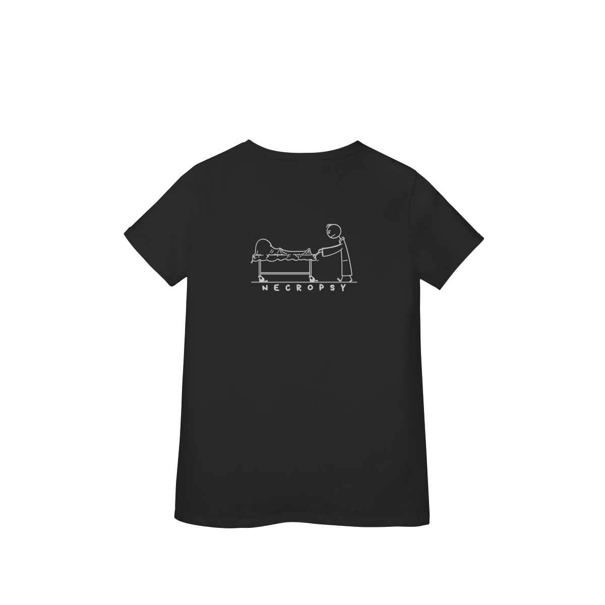 Uma peça que mistura arte, realismo e significado: estampa um bonequinho empurrando um carrinho com um corpo, em direção à necropsia, evocando reflexão sobre vida, morte e o papel da perícia criminal. Design impactante e conceitual, ideal para quem aprecia moda com mensagem e consciência. Combina arte sombria e temática forense, evocando a autoridade e o mistério do trabalho pericial.