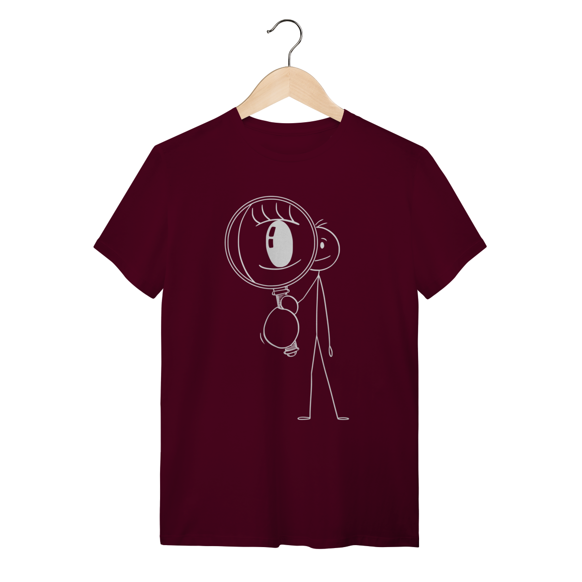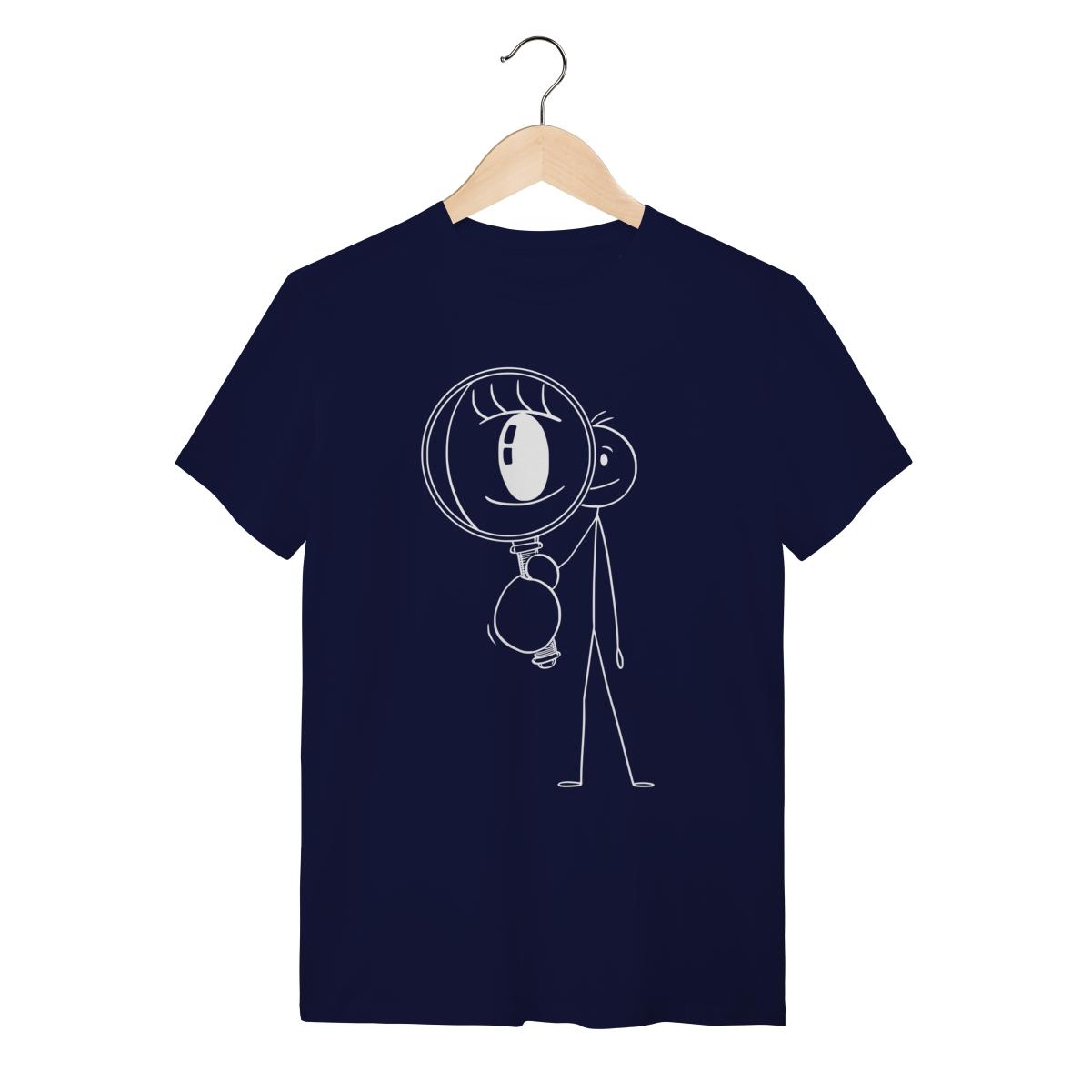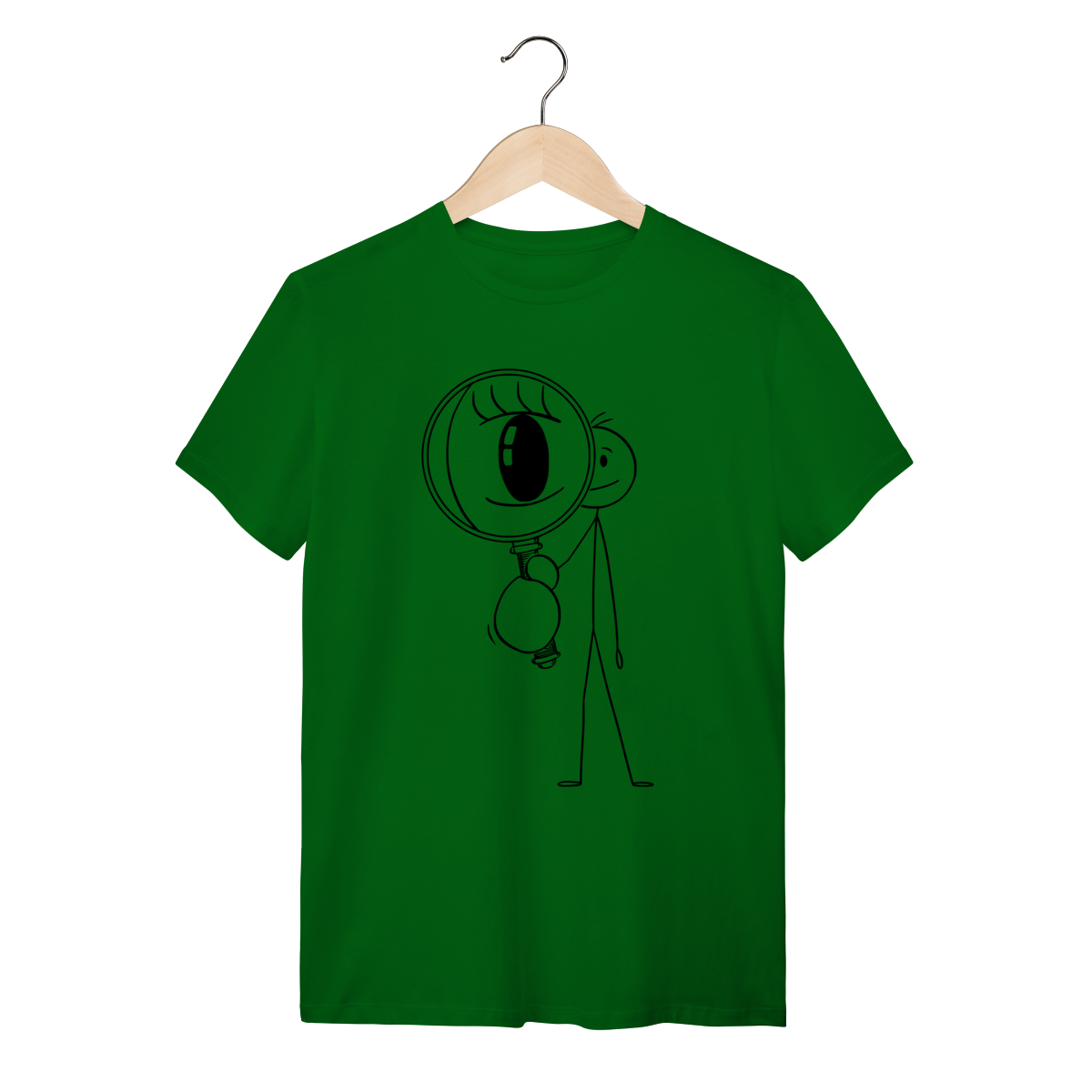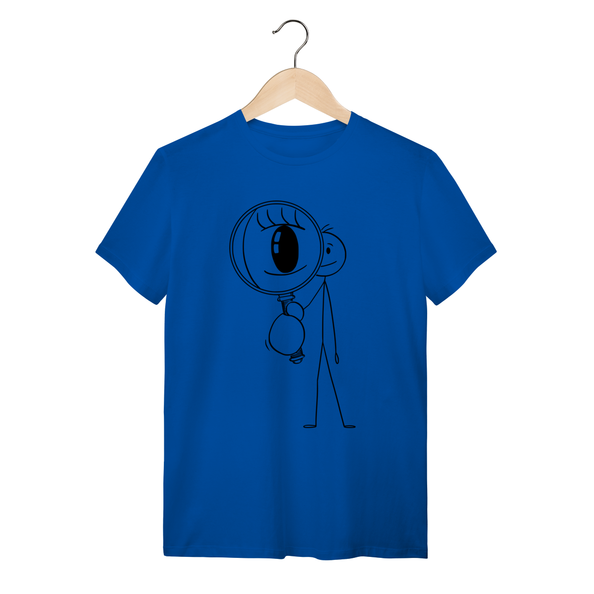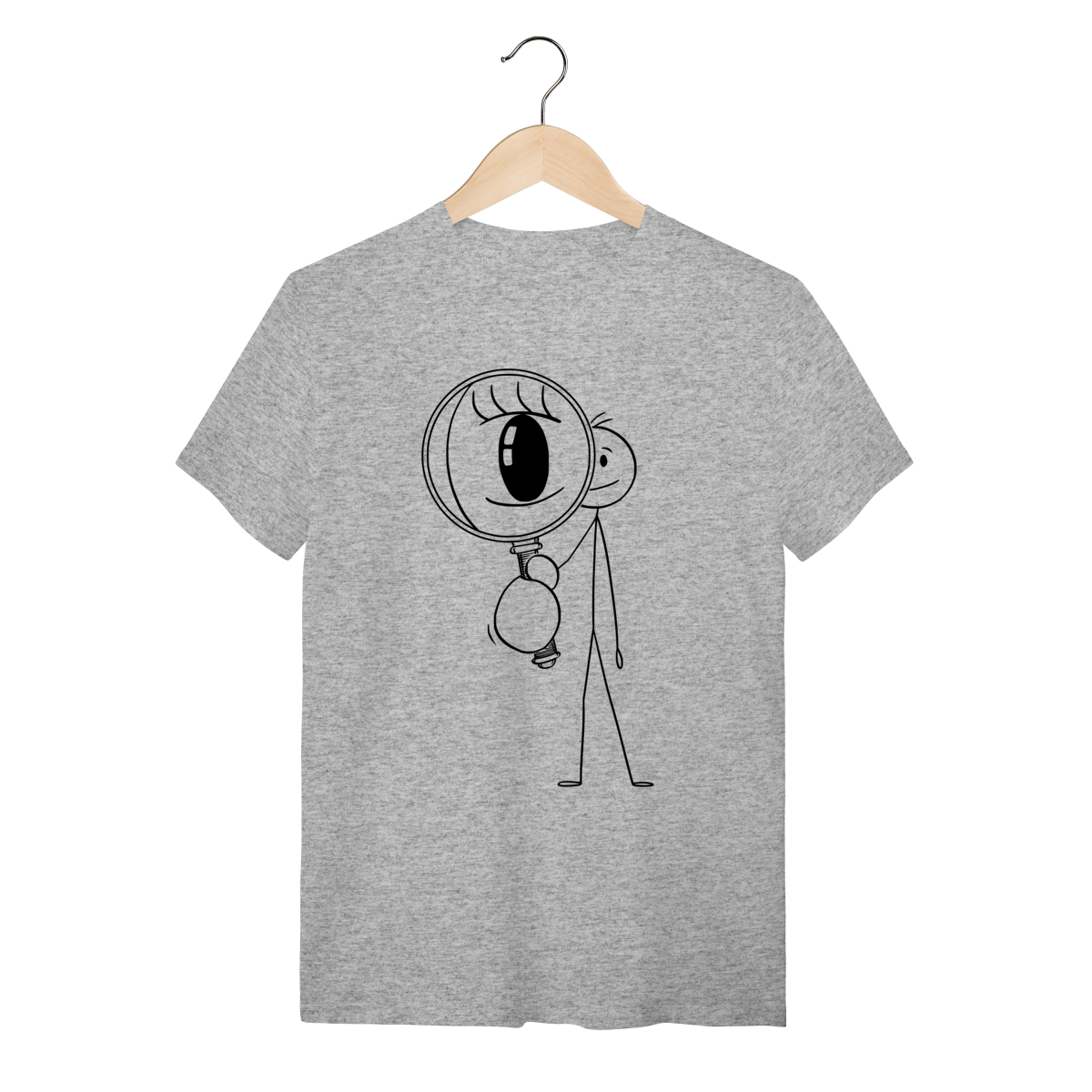Mergulhe no mistério com esta camiseta que inspira curiosidade: um bonequinho observando com lupa, o olho destacado — uma metáfora visual para quem busca provas invisíveis e rastros que poucos enxergam.