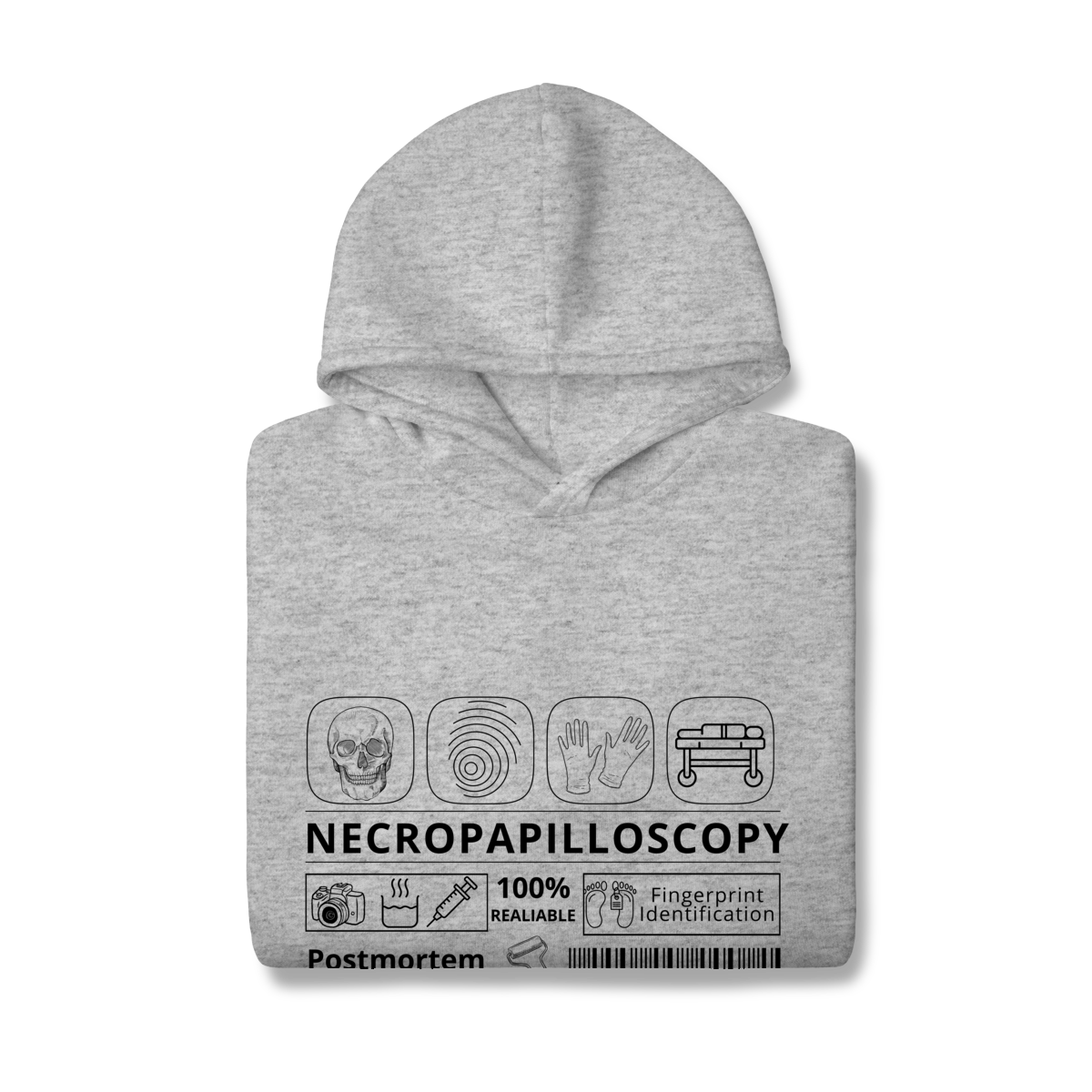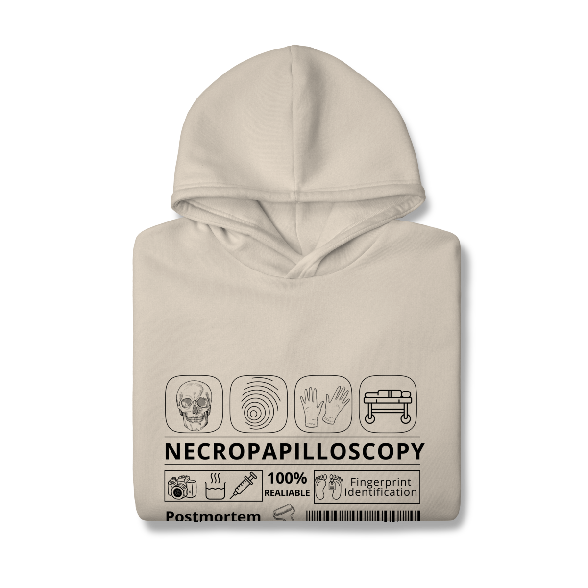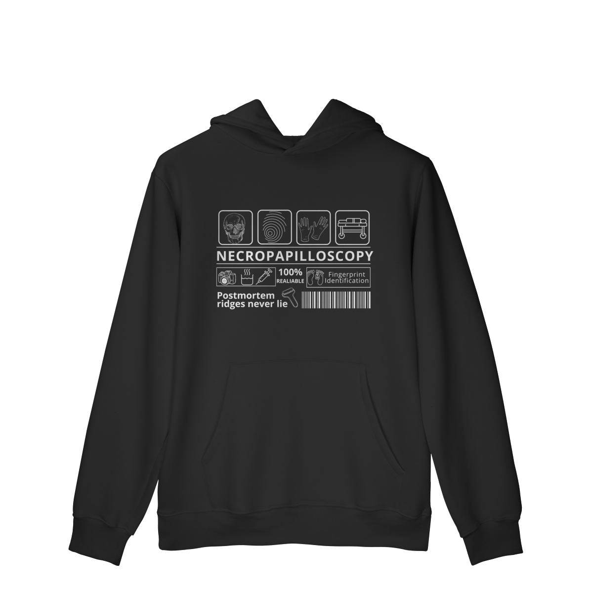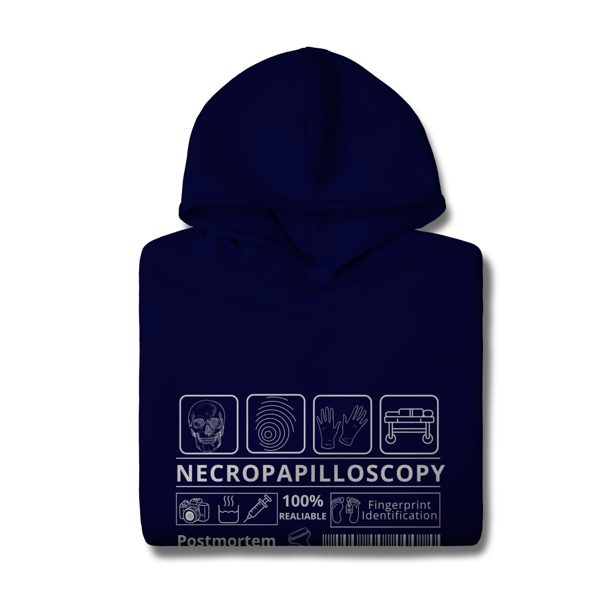 Celebre a ciência da identificação humana com estilo e propósito. Esta camiseta traz a palavra “Necropapiloscopia” em destaque, acompanhada por ilustrações que lembram os métodos usados nessa técnica.