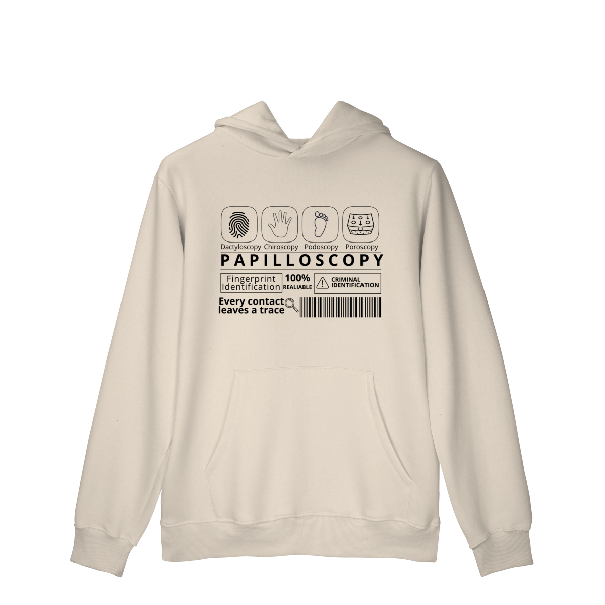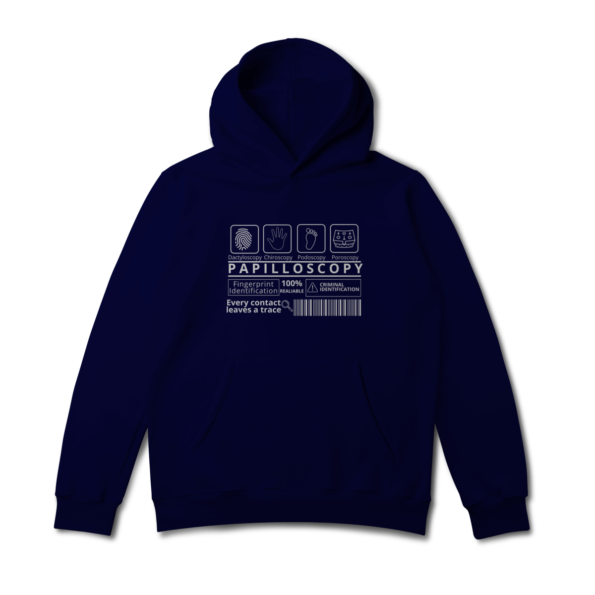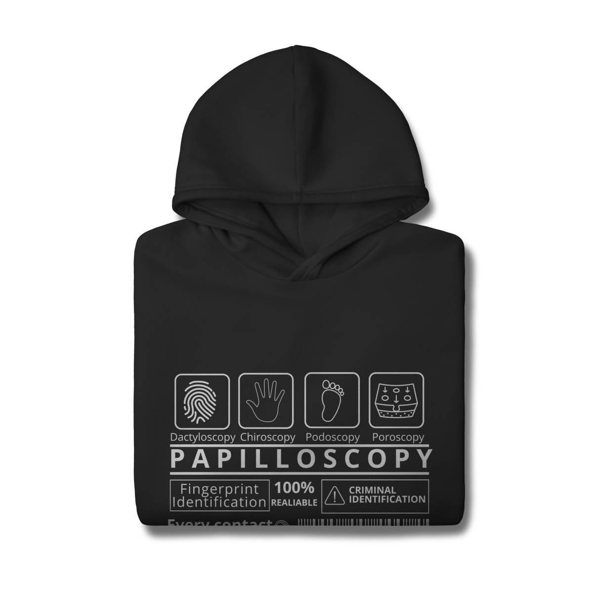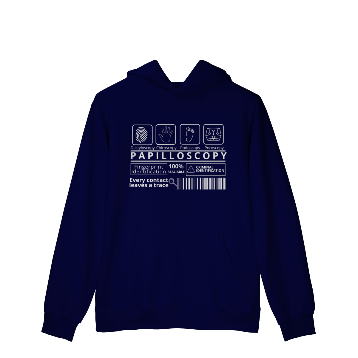 A estampa destaca os ramos da papiloscopia, criando uma composição visual inteligente e cheia de significado. Design exclusivo e significativo. Conforto e qualidade: ideal para quem busca uma peça temática, mas confortável para o uso diário. Apelo educativo e criativo: perfeita para estudantes, profissionais da área forense ou entusiastas da ciência criminal.