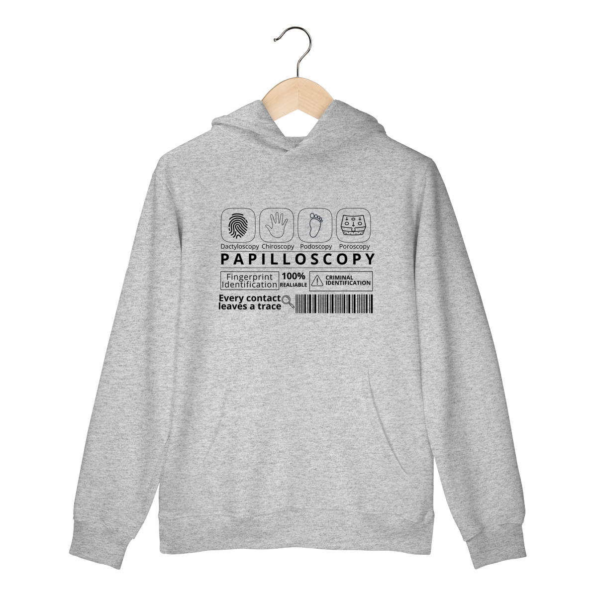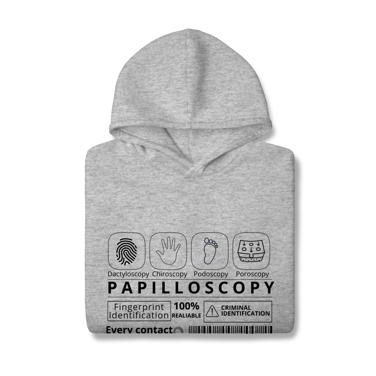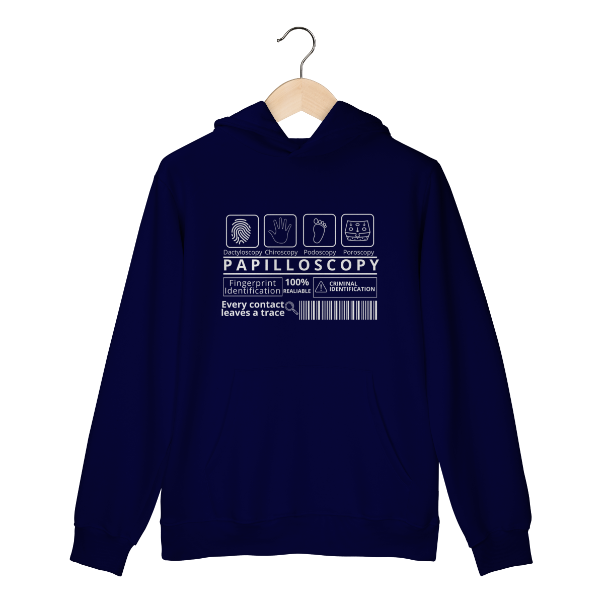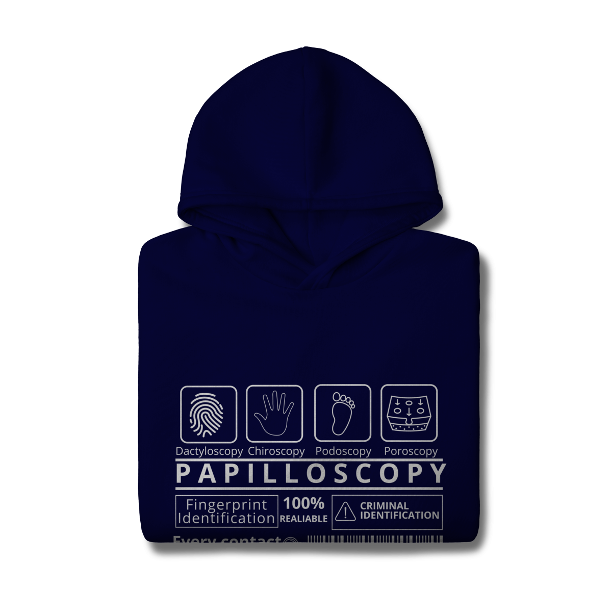 A estampa destaca os ramos da papiloscopia, criando uma composição visual inteligente e cheia de significado. Design exclusivo e significativo. Conforto e qualidade: ideal para quem busca uma peça temática, mas confortável para o uso diário. Apelo educativo e criativo: perfeita para estudantes, profissionais da área forense ou entusiastas da ciência criminal.
